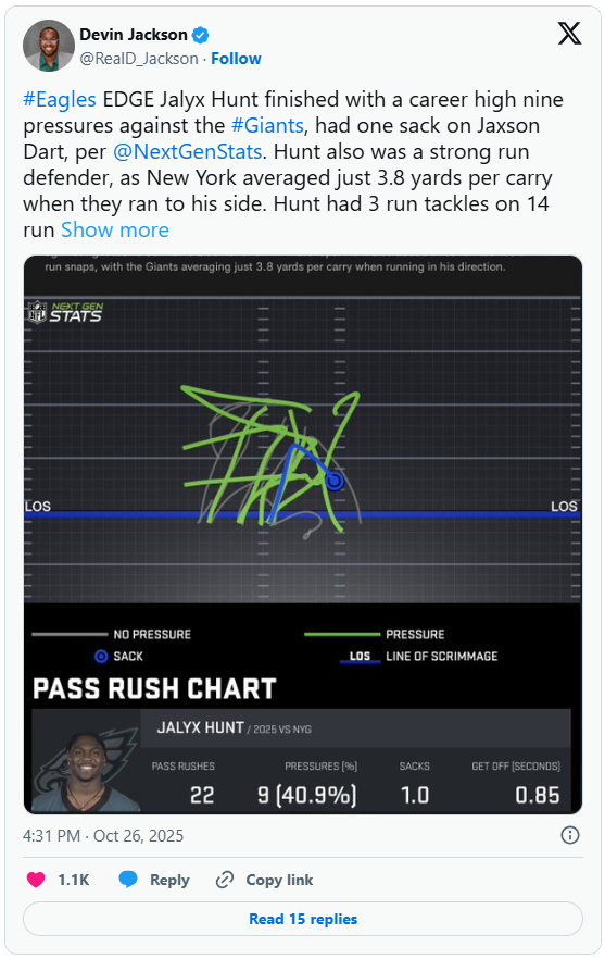 Posted Monday at 07:20 PM2 days Eagles Run Over the GiantsPosted October 26th, 2025The Eagles finally found an answer to their struggling run game…playing the Giants. Over the first seven games of the year, the Eagles had a total of 617 rushing yards. On Sunday the guys in kelly green ran for 276 yards and dominated the Giants. Finally, the Eagles looked like…the Eagles.Saquon Barkley sprinted 65 yards for a TD on the second play of the game, giving us all a hint of how things would go. Barkley finished with 150 yards on only 14 carries. Tank Bigsby joined the fun, running for 104 yards on 9 carries. The Giants had no answer for them.We’ve spent a lot of this season blaming the OL for a lot of the issues in the run game. Today we have to give the guys up front a lot of credit. Brett Toth started at center, but you wouldn’t know it. The announcers weren’t calling his name on a regular basis or pointing out critical mistakes. Usually an OL flying under the radar means he’s doing his job well. I’ll be interested to see what the tape shows. Toth did have a good block on the long TD run and looked good on a couple of pulls.Kevin Patullo did a good job with the runs he called. With his changes and improved OL play, the run game could be headed in the right direction, and that would be huge for the rest of the season. You need impact plays from Barkley and the other RBs. The Eagles got them today.The Eagles won the LOS on both sides of the ball. The OL got good push in the run game and the DL limited the Giants to 21-68 on the ground. Cam Skattebo suffered a horrible injury (do not go watch that) and finished just 3-12. The Eagles had 5 sacks and got good pressure on Jaxson Dart. For the first time all season, the Eagles out-gained their opponent, 427-246. This was a complete game.What about Jalen Hurts and the passing attack? There are normally issues when AJ Brown misses a game. Hurts only threw for 179 yards. That’s because the Eagles ran so well they didn’t have to throw. He finished 15-20 with 4 TDs and a rating of 141.5. This has to be the best two-game stretch of his career. There are some things to nitpick, but Hurts played well and helped the Eagles to their best offensive showing of the year.With Brown out, other guys stepped up. Dallas Goedert had a pair of TD receptions. Jahan Dotson hauled in a 40-yard TD catch. He had to jump up and go over the CB to get to that ball. Barkley caught a short TD pass. Rookie Darius Cooper drew a PI call.The defense was worlds better than the first Giants game. They played more zone coverage and that cause Dart to hold the ball longer as he tried to find the open guy. There were times when the coverage was outstanding.Jalyx Hunt played his best game of the year last week. He built on that with another strong performance.If Hunt starts to play well consistently and you add Nolan Smith and Brandon Graham back to the mix, the Eagles pass rush could be in good shape for the second half of the season.One of the stories of this game was bad officiating. The Eagles benefited from some calls and were hurt by others. No matter which side you were on, everyone agreed that the officials had a bad day. Brian Daboll looked like he was about ready to explode.Well done, Mr. Bama.Nick Sirianni can feel good about his team after a game like this. They blocked and tackled well. They were physical. They produced big plays on offense and limited them on defense. And they didn’t turn the ball over. That’s winning football.The Eagles now head to their bye week for some much needed rest. Barkley hurt his groin in the game. The team was already missing three starters. Some of the guys who did play weren’t close to 100 percent. Getting rested and healthy will be huge for this team heading into the second half of the season.https://igglesblitz.com/2025/10/eagles-over-giants/