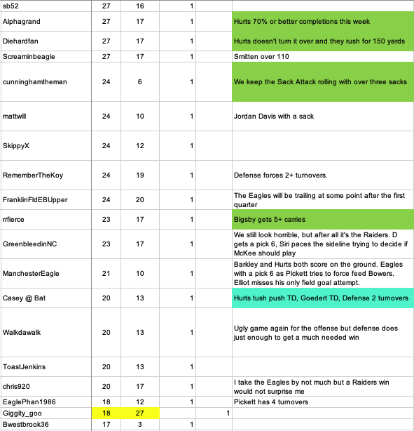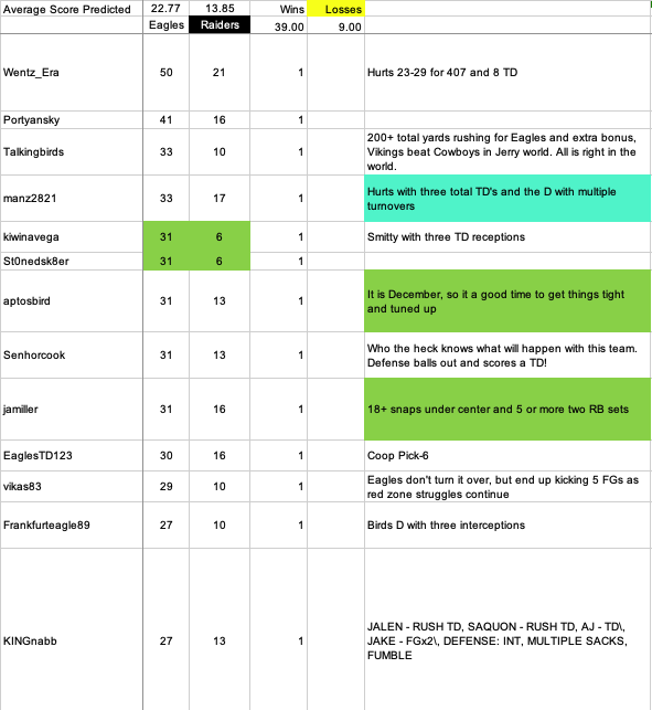 10 hours ago10 hr Final Raiders Game Score Prediction ResultsNice to get back on track, even against a piss-poor team. With that said, here are the week's prediction results. A surprisingly robust total of 48 predictions were recorded with 9 for a Raiders win and 39 for an Eagles win.The 31-6 predictions of @kiwinavega and @St0nedsk8er were remarkably close ... only six points off the actual score, so they both get chicken dinners. The next closest predictors were thirteen points off ... @aptosbird (31-13) @Senhorcook (also 31-13) and @cunninghamtheman (24-6). @jamiller also got the Eagles' 31 points right, and nobody got the Raiders' zero points right, although @Bwestbrook36's 17-3 prediction was pretty damn close to zero.It was a good week for Bonus picks. Ten of them were correct or mostly correct.Given his 31-13 score prediction it is no surprise that @aptosbird was correct with his "It is December, so it a good time to get things tight and tuned up"@jamiller was spot on with his "18+ snaps under center and 5 or more two RB sets"For the second week in a row @Alphagrand was right, this time with "Hurts 70% or better completions this week"@Diehardfan was also right with "Hurts doesn't turn it over and they rush for 150 yards"@cunninghamtheman with "We keep the Sack Attack rolling with over three sacks" was on target@rrfierce hit the nail on the head with "Bigsby gets 5+ carries"@EaglesIreland was correct with his "Hurts to throw less than the five interceptions"@Sack that QB sent one through the uprights with "Elliott won't miss a kick today"and the three partially/mostly corrects were@manz2821 who got the first half right with "Hurts with three total TD's and the D with multiple turnovers"@Casey @ Bat who correctly rode the Goedert train with "Hurts tush push TD, Goedert TD, Defense 2 turnovers"@NOTW with "Someone will ask "Is Pam Oliver drunk?" The specific quote was wrong, but the sentiment was conveyed more than once.In the first fifteen weeks the closest predictors have been@Freshmilk and @Bwestbrook36 in Week One's 72 predictions@just relax in Week Two's 55 predictions@Diehardfan in Week Three's 56 predictions@Screaminbeagle in Week Four's 61 predictions@Walkdawalk in Week Five's 59 predictions@Giggity_goo in Week Six's 50 predictions@kiwieagle and @Diehardfan in Week Seven's 52 predictions@McMVP in Week Eight's 50 predictions@b_west3 in Week Ten's 54 predictions@Talkingbirds in Week Eleven's 56 predictions@RLC in Week Twelve's 62 predictions@pisceschica in Week Thirteen's 44 predictions@DeathByEagle in Week Fourteen's 44 predictions@kiwinavega and @St0nedsk8er in Week Fifteen's 48 predictionsHere is the final list of the predictions and bonuses: