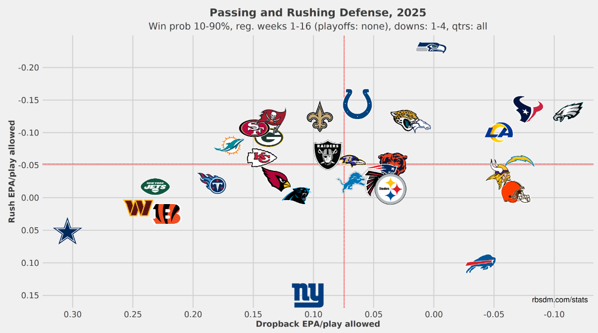 December 22, 2025Dec 22 Author 2 hours ago, Connecticut Eagle said:Defense since the bye...BTW...if you filter out for garbage time (win percentage over 90%), we have the best defense for the entire season (EPA/play).