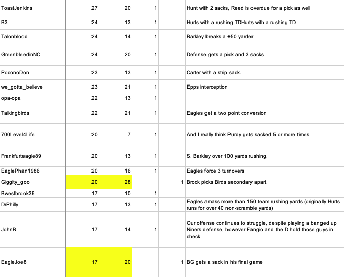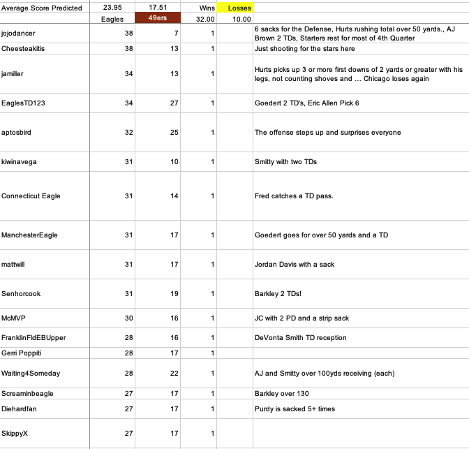 22 hours ago22 hr Saturday morning Eagles-49ers Game Score Predictions -- 36 hours until Kickoff28 predictions recorded thus far. 20 are for an Eagles win and 8 for a Niners win. The margin of the average predicted score has expanded to Eagles 23 49ers 18.As we do each week, we are gathering Game Score predictions. As always, please tag your prediction post with @mattwill that way I will be sure to see/record it. Score predictions can also have an optional "Bonus Pick" tiebreaker prediction. I will be taking predictions right up until Kickoff. If someone posts a prediction without a tag, please reply to it including the @mattwill tag.The 28 recorded predictions are: