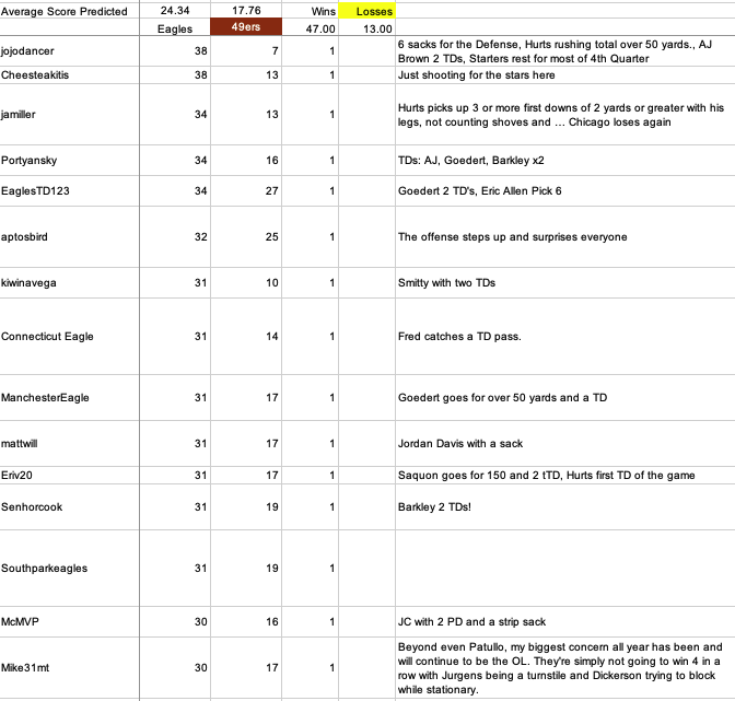 6 hours ago6 hr Sunday 1:00 PM Eagles-49ers Game Score Predictions -- 3 hours until Kickoff60 predictions recorded thus far. 47 are for an Eagles win and 13 for a Niners win. The margin of the average predicted score continues to be Eagles 24 49ers 18.As we do each week, we are gathering Game Score predictions. As always, please tag your prediction post with @mattwill that way I will be sure to see/record it. Score predictions can also have an optional "Bonus Pick" tiebreaker prediction. I will be taking predictions right up until Kickoff. If someone posts a prediction without a tag, please reply to it including the @mattwill tag.The 60 recorded predictions are: