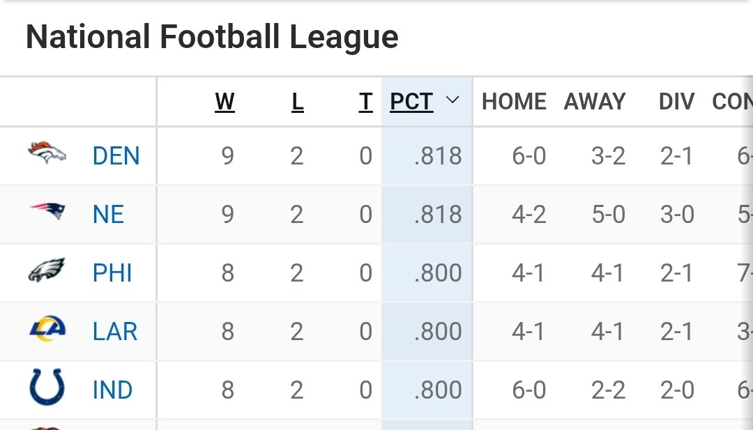 November 17Nov 17 2 hours ago, Iggles_Phan said:The Patriots? The Broncos? The Colts? The Rams?Because of the bye, the Eagles are 3rd. Top in the NFC.