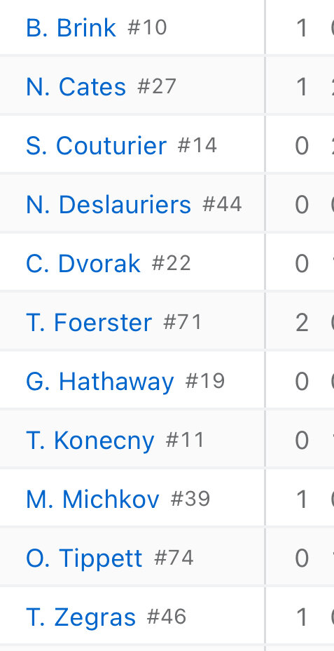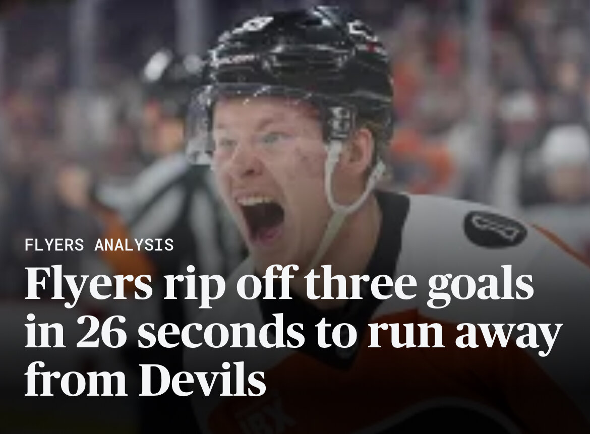 Sunday at 03:46 AM2 days 24 minutes ago, mattwill said:Off topic:Tonight’s Flyers game was an incredibly heartening win. First, it was the second game of a back-to-back set, which up to tonight have been killers … and was a 6-3 win. Second, the box score below shows the six goal scorers. The youth movement paying dividends.They beat STL on Thursday so this wasn’t a true back-to-back.Their next back-to-back games are next Saturday-Sunday at NYI and at NJ. That will tell a lot because they’ll almost surely have to play one of those games with Ersson in net, who appears to be afraid he might get hit with the puck.Still, 11-6-3 is nothing to sneeze at. I assumed at least 6 points in the standings from firing Tortorella and nothing else. Trevor Zegras has been a much better trade acquisition than I expected.