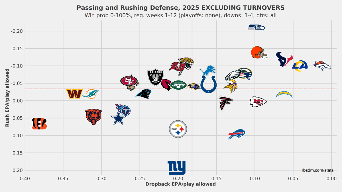 1 hour ago1 hr Author The Bears are +19 in turnovers when they win. Minus 3 in their losses.Using EPA/play, the Bears have the 22nd ranked defense. (We are 8th.) If you take away plays with turnovers, they drop to 31st. (We are 10th).This may be the week where Sirianni's conservative approach to offense is necessary.