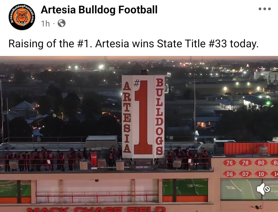 November 30Nov 30 15 hours ago, Cliftoma said:My high school in New Mexico won their 33rd State Championship today. Amazing football community that has sustained success for decades. The whole town revolves around Bulldog football. Hell, the town practically shuts down on game night and they even move Halloween if it falls on Friday lolThe Bulldogs came back down 24-11 to Roswell in the 4th with a blocked field goal and recovered onside kick to capture #33. Maybe Sirianni can poach the head coach since he likes himself a high school offense.Did a FLETC Active Shooter course in Artesia at some old underground 50’s underground bunker school. Crazy the sustained success some places like that have. Was stationed in ‘title town’ Valdosta for about 7 years. Their 2 high schools combined for something absurd in terms of state titles like that.