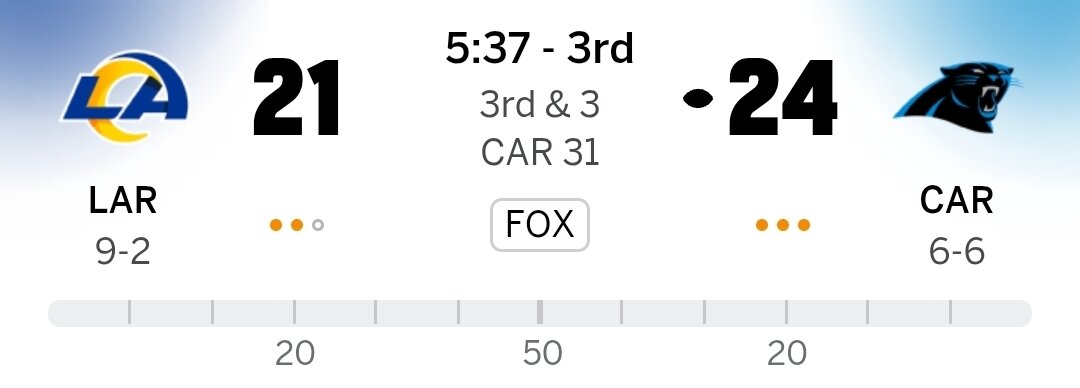 November 30Nov 30 21 minutes ago, HazletonEagle said:Rams are winning 21-17. First INT was a tipped ball.They've moved the ball with ease against Carolina on every single drive. Rams win was never in question.3 minutes ago, HazletonEagle said:Rams just went 3 and out. Now they could be in trouble.