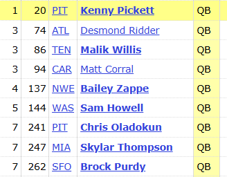 December 1Dec 1 49 minutes ago, NOTW said:Of course there are better QBs than Hurts. Consider how things played out though. Let's say they never drafted Hurts (which was a surprise to us at the time after signing Wentz to that contract). The 2020 season goes the same and they fire Doug and get rid of Wentz. Then they need a new QB. And new Head Coach Nick Sirianni can give his input to the QB he will work with.The QBs taken in the 2021 draft:They originally had the #8 pick. Would Howie have traded up for either Lawrence (meh), Wilson (bust) or Lance (bust)? They went #1-#3, and Howie would have had to trade up more capital to get them, leaving less assets for what they did the next year (trade for AJ Brown, draft Davis, trade back to get future pick to draft Carter). Would he have stayed put and taken Fields (bust) or Mac Jones (bust)?Any one of those guys would get roasted by fans more than Hurts. And they wouldn't have DeVonta Smith who they took in that draft.The Eagles also signed Joe Flacco that year, then traded him. Perhaps he could have been a stop gap. But would they have won games? Flacco didn't do ish for 4 years, until this year all of a sudden a resurgence.If they did that and waited until 2022 to draft a QB, the options were:Again, each of them would be criticized just as much or more than Hurts.Hurts isn't a great passer and we will see how things go, when the time comes that they move on from him who they replace him with. Whoever that guy is will get run out of town by the fans too. Fans criticized McNabb, Vick, Wentz, every QB. Eagles fans are never happy with the QB.Supposedly Howie liked Wilson so despite people here whining I’m pretty happy with 2 Super Bowls and one championship in that time.
