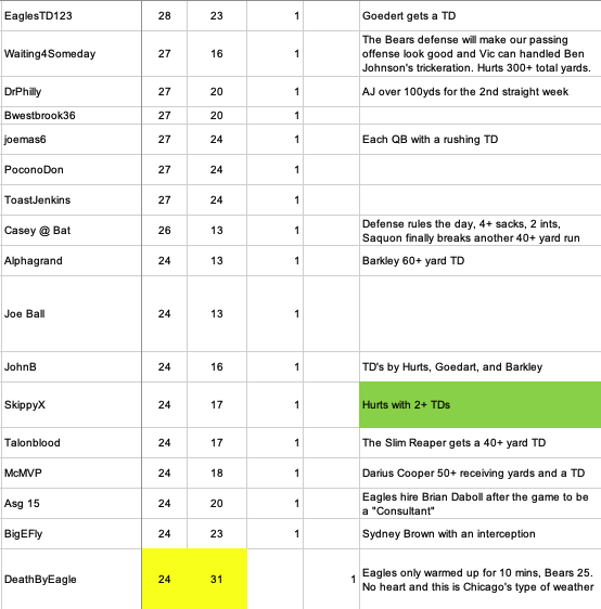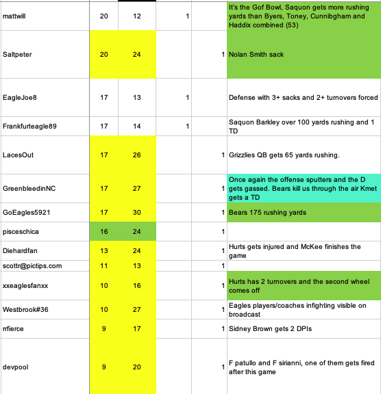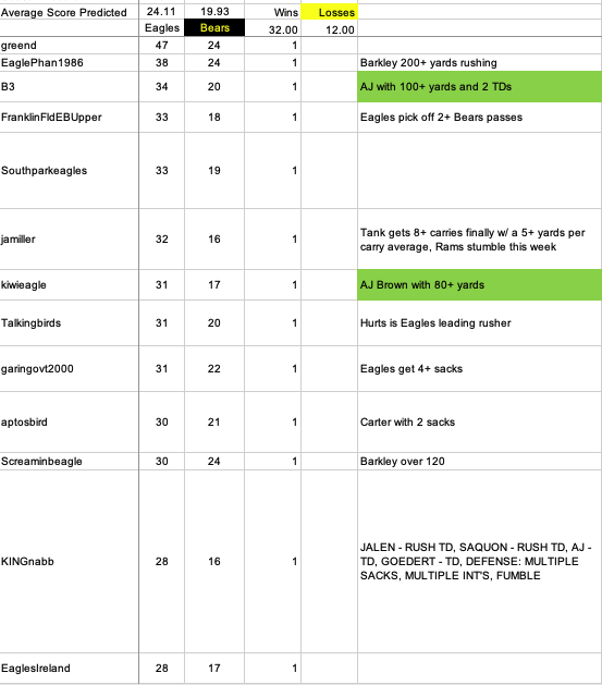 Friday at 04:57 PM1 day Final Bears Game Score Prediction ResultsAt the risk of repeating myself, "Well that sucked!" With that said, here are the week's prediction results. A total of 44 predictions were recorded with 12 for a Bears win and 32 for an Eagles win.@pisceschica 's prediction of a Bears 24-16 win was the closest, only one point off, and wins the chicken dinner. @LacesOut was a close second with his prediction of a 26-17 Bears win and he gets a cornish hen dinner.It was a better week for Bonus picks. Seven were correct.@GoEagles5921 with "Bears 175 rushing yards"@xxeaglesfanxx with "Hurts has 2 turnovers and the second wheel comes off"@B3 with "AJ with 100+ yards and 2 TDs"@kiwieagle with "AJ Brown with 80+ yards"@SkippyX with "Hurts with 2+ TDs"@mattwill with "It’s the Gof Bowl, Saquon gets more rushing yards than Byers, Toney, Cunnigham and Haddix combined (53)"@Saltpeter with "Nolan Smith sack"One more Bonus prediction deserves to be mentioned@GreenbleedinNC was 2/3 right with "Once again the offense sputters and the D gets gassed. Bears kill us through the air Kmet gets a TD"In the first eleven weeks the closest predictors have been@Freshmilk and @Bwestbrook36 in Week One's 72 predictions@just relax in Week Two's 55 predictions@Diehardfan in Week Three's 56 predictions@Screaminbeagle in Week Four's 61 predictions@Walkdawalk in Week Five's 59 predictions@Giggity_goo in Week Six's 50 predictions@kiwieagle and @Diehardfan in Week Seven's 52 predictions@McMVP in Week Eight's 50 predictions@b_west3 in Week Ten's 54 predictions@Talkingbirds in Week Eleven's 56 predictions@RLC in Week Twelve's 62 predictions@pisceschica in Week Thirteen's 44 predictionsHere is the final list of the predictions and bonuses: