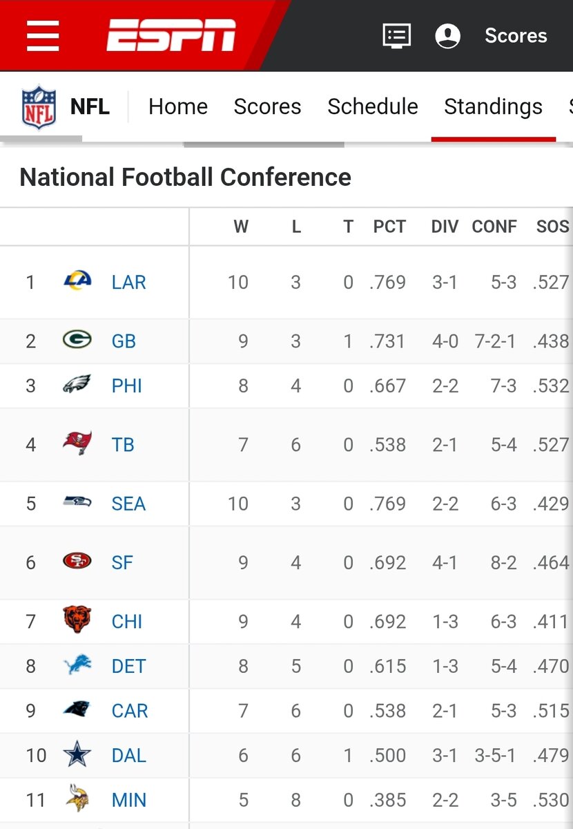Monday at 01:31 AM2 days 3 minutes ago, KINGnabb said:Rams, Seahawks, Packers, 49ers, Bears and Lions all play each other in the last 4 weeks. Eagles just need to take care of their own business.The Eagles are currently 1 game out of first