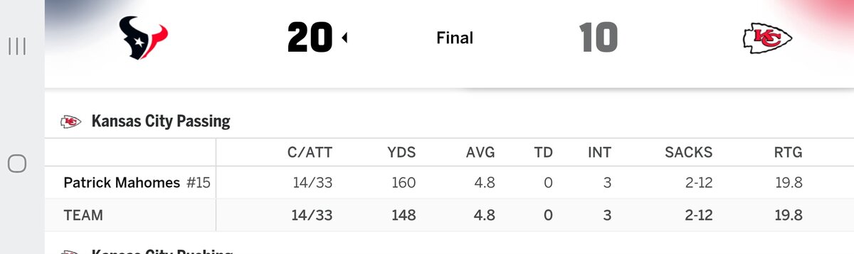 Monday at 04:36 AM1 day That was a huge last drive for Mahomes.He got his passer rating up to 19.8 instead of 14.0