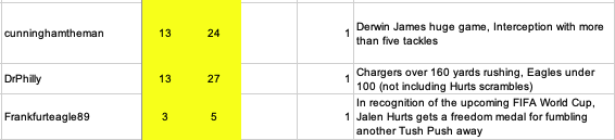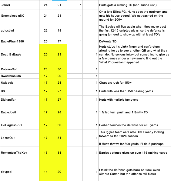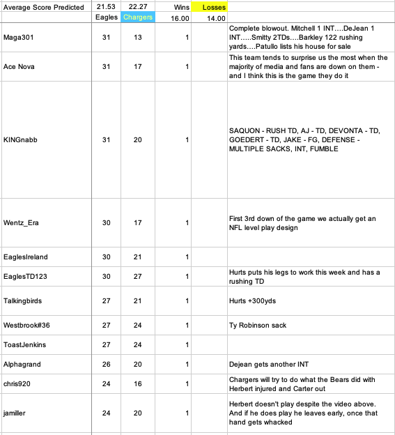 Monday at 03:11 PM1 day Monday 10:00 AM Eagles-Chargers Week 14 Game Score Predictions Update - 10 hours until Monday Night KickoffAfter the flurry of this morning's submissions, 30 predictions are recorded with 16 for an Eagles win and 14 for a Chargers win. The average predicted score has moved to an Eagles 22 Chargers 22 ... after rounding. The raw averages still favor the Chargers.I have again relied 100% on the @mattwill notifications this week. If you don't see your name in the list below, I either missed your prediction or you haven't submitted one yet.At the risk of being repetitive, please tag your prediction post with @mattwill. That way I will be sure to see/record it. Score predictions can also have an optional "Bonus Pick" tiebreaker prediction. I will be taking predictions right up until Kickoff.The list of the 30 predictions that are recorded is presented below, sorted high to low by Eagles points predicted.