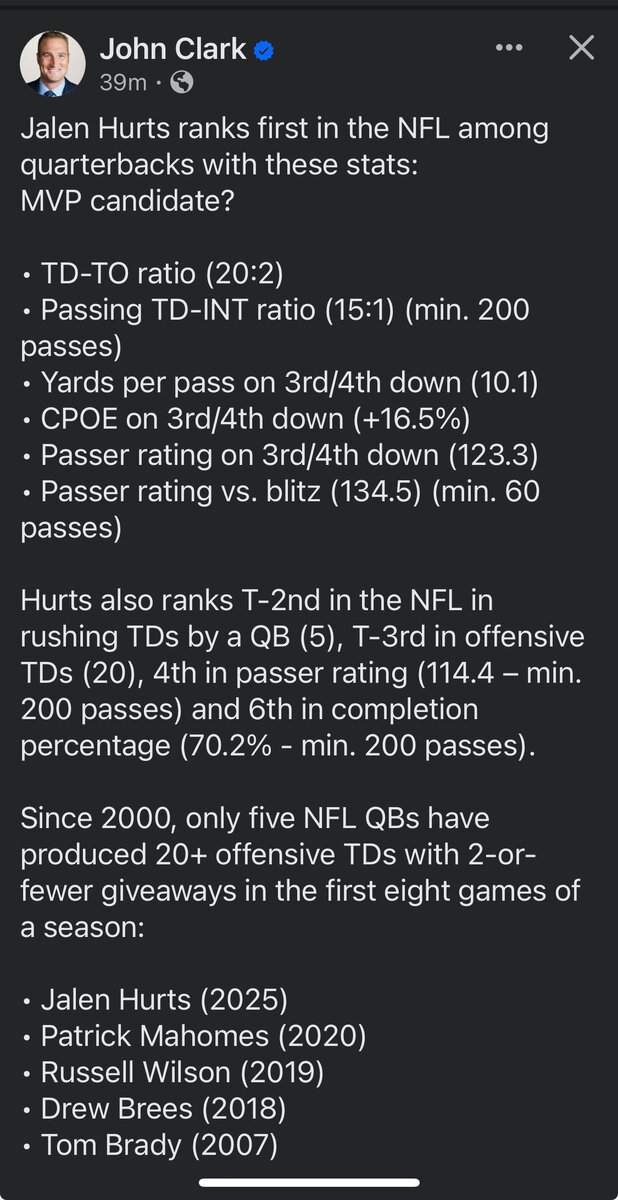 21 hours ago21 hr 53 minutes ago, Ace Nova said:Check these stats out - not all against zone defenses but show how incredibly clutch he is on 3rd and 4th downs - only elite QB’s have comparable stats …Hurts won't even figure into the MVP discussion -- nor should he. The current odds for MVP are as follows:2025-26 NFL MVP oddsJosh Allen, QB, Bills: +180What to know: Allen is the reigning MVP, and in a matchup between him and his archival Patrick Mahomes, Allen's Bills won a 28-21 Week 9 showdown. In that matchup, Allen completed 23 of 26 passes for 273 yards and a touchdown. He also added two rushing TDs. With that, Allen is favored to repeat as MVP once again, after being the +350 second choice last week.Patrick Mahomes, QB, Chiefs: +350What to know: The two-time regular-season MVP was the +115 favorite last week, but he struggled in a Week 9 loss to the Bills, completing just 15 of 34 passes for 250 yards and a pick. In the last two games, Mahomes has three TDs and three interceptions for the 5-4 Chiefs.Drake Maye, QB, Patriots: +425What to know: The Pats have won six straight behind their second-year QB, who is quickly turning into a star. In a Week 9 win over Atlanta, he had 259 passing yards, two touchdowns and a pick, guiding New England to a 24-23 win. He was at +500 last week. Matthew Stafford, QB, Rams: +550What to know: The Rams are 6-2, and both of their losses involved some bad luck on their end. However, Stafford has an NFL-best 21 passing TDs and also has 2,147 yards through the air. In a Week 9 win over the Saints, Stafford had 281 passing yards and four touchdowns. He moved from +1200 last week to +550. Baker Mayfield, QB, Buccaneers: +1600What to know: Mayfield threw for 152 yards in a 23-3 win over New Orleans in Week 8. It was the first game this season in which he did not throw a touchdown. The Bucs are 6-2 and had a bye in Week 9. Sam Darnold, QB, Seahawks: +2000 What to know: Sam Darnold is finally getting the respect he deserves. Seattle is 6-2 and its two losses have come by a combined six points. The Seahawks dominated Washington in Week 9, behind 330 passing yards and four TDs from Darnold. He completed 21 of 24 passes as well. Lamar Jackson, RB, Ravens: +2200What to know: Can you ever really count Lamar out? He's only seen the field in five games this season, but after missing three consecutive games, Jackson was back with a vengeance in Baltimore's Week 9 win over Miami. He was 18-for-23 passing for 204 yards and four touchdowns.