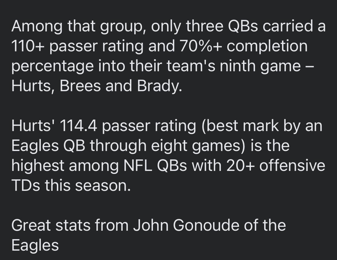 21 hours ago21 hr 58 minutes ago, Ace Nova said:Check these stats out - not all against zone defenses but show how incredibly clutch he is on 3rd and 4th downs - only elite QB’s have comparable stats …Yeah I've already said Im encouraged by the growth of Patullo's offense and Hurts' play within it. Patullo is bringing out the best in him and by the end of the year maybe we see the best version of Jalen yet.But you guys fall for a lot of nonsense just because it implies Hurts is great and its silly of you.