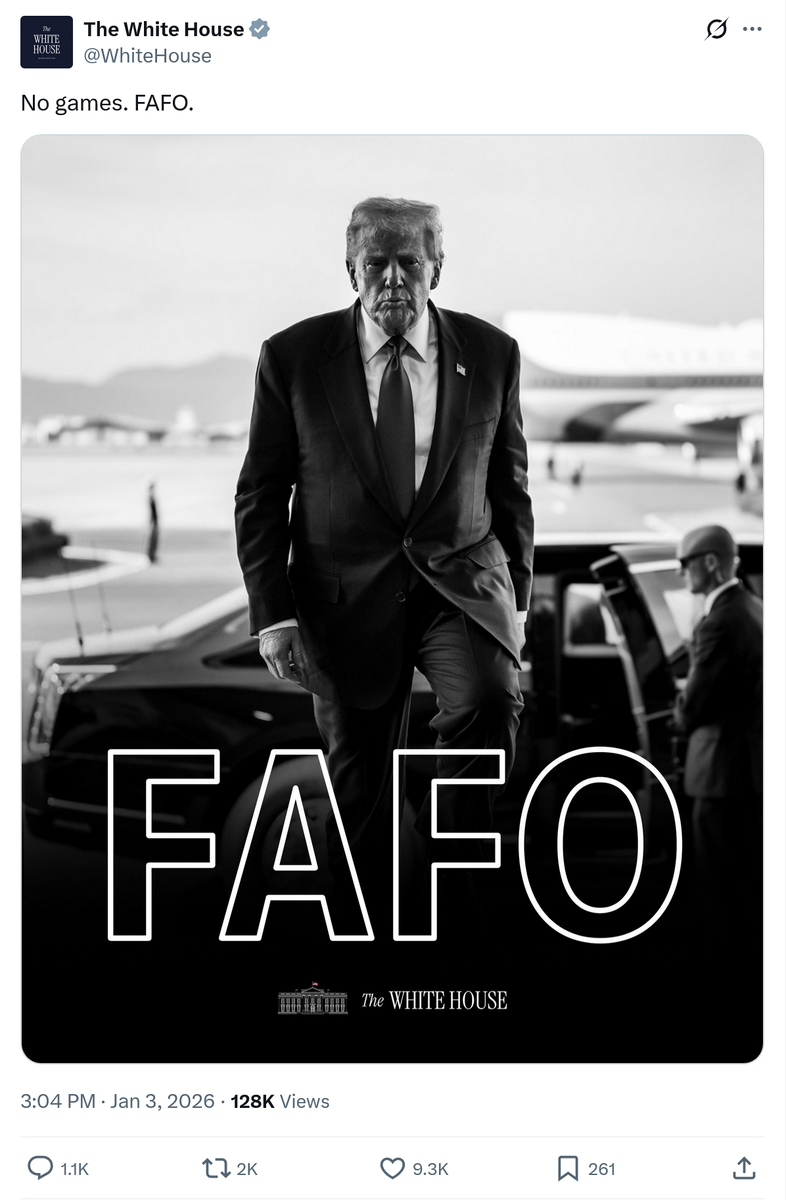 January 3Jan 3 People are criticizing these Venezuela strikes, but early January is traditionally the time of year that Trump sends people to a nation’s Capitol in order to kidnap their leaders. Respect other people’s cultures!