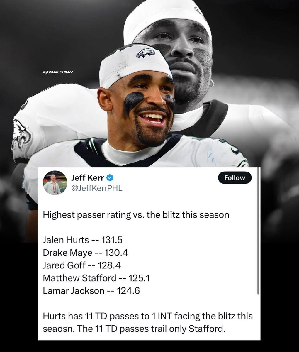 Monday at 07:24 PM4 days People need to accept Hurts for what he is. He's not the QB you want if your goal is to go for 1600 receiving yards, but his ability to minimize turnovers and add to the ground game, while also throwing a pretty good deep ball, makes him valuable to a team with a top flight defense. The front office is slowly beginning to realize this, and I suspect that as time goes on, more resources will be invested in the defense. Hurts is a high floor, low ceiling QB which is perfectly fine with this roster. But one of DeVonta or AJ is likely getting moved this offseason (my bet would be AJ).