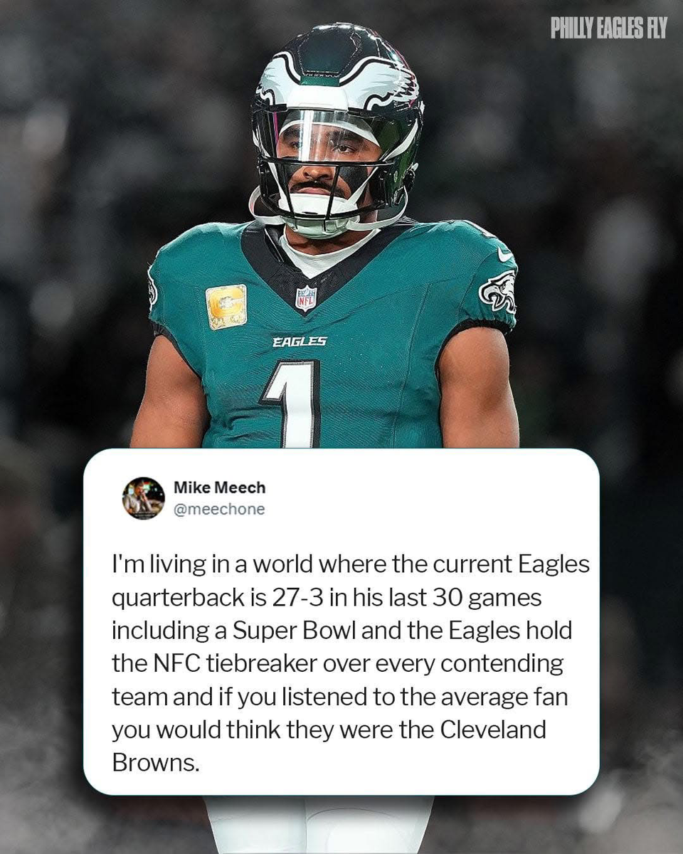 November 22, 2025Nov 22 On the radio I hear this morning they believe the Eagles will win, and they expect the offense to perform well, but if they don’t (regardless if they win) they will trash the offense. The next moment they expect the offense to perform well, they add the caveat, but it’s the Cowboys. So they can’t win in that scenario regardless. A caller then points out all of the injuries on the offensive line and basically how they have dealt with it all season and then the caller asked what can the Eagles do about it, because it’s clearly causing issues in particular with the offensive line? The host then didn’t put the blame on the coaching staff, he said it’s on Jalen Hurts. He then proceeded to run down all of the perceived deficiencies of Jalen Hurts, but still expected him to overcome all of these issues. So you claim that Jalen isn’t capable of overcoming the issues, because he’s not talented enough while expecting him to do so, while never mentioning his rookie play caller who is calling the plays that end up being first down losses or some stupid pass to the flat. He also went on to say elite quarterbacks can overcome the deficiencies of the offensive line (this is three injuries on the Eagles offensive line and a first year starter BTW) which is interesting considering everyone in the league and media tell me that Josh Allen is the best of the best while he lost to the Texans with a backup quarterback. The irony here is the Eagles ARE OVERCOMING THESE CHALLENGES, BECAUSE THEY LEAD THE NFC RIGHT NOW. Seriously Philly media is garbage.
