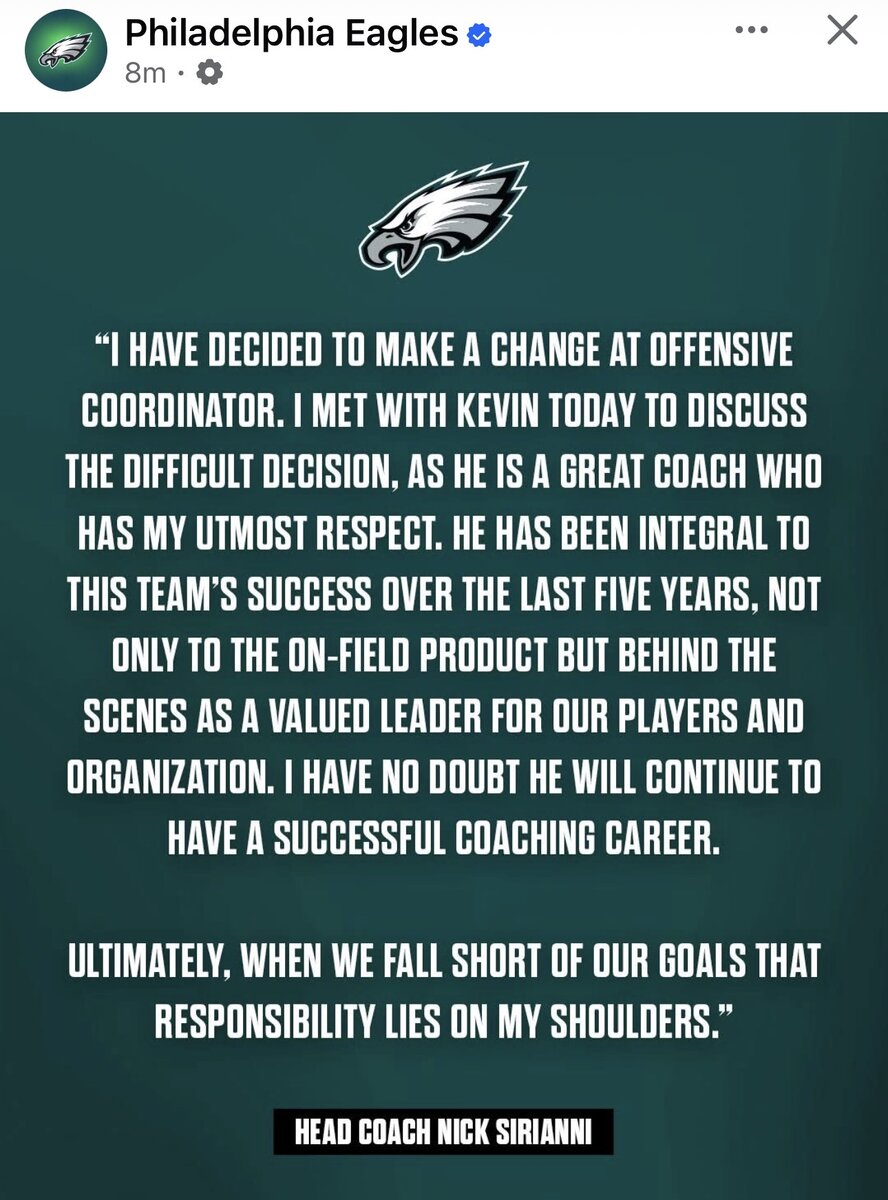 January 13Jan 13 1 hour ago, EazyEaglez said:Agreed. Let’s be honest. Patulo’s offense is Nicks offense. That’s why we saw no real improvement. KP was worse than Johnson, but now Jalen and Sirianni are on notice.And if we're being even more honest, let's acknowledge that the Howie never wanted to hire Sirianni in the first place and only did so because he was out of options. And that the only reason he's still here is that Lurie doesn't want the optics of firing someone who's had this much success.I'm convinced neither likes Sirianni all that much as a coach - every other coach they've hired has called the plays. They're just stuck between a rock and a hard place.