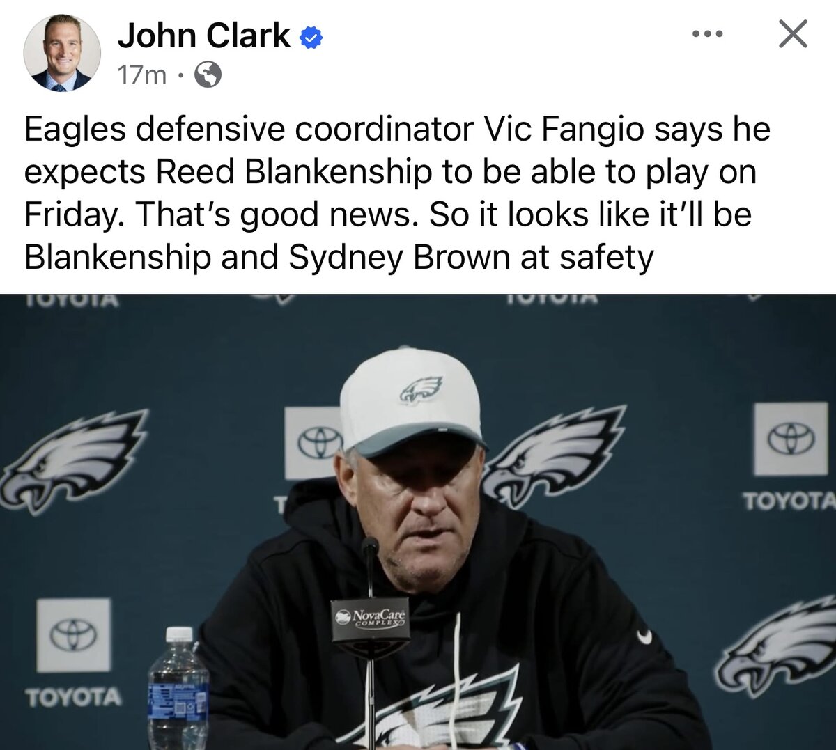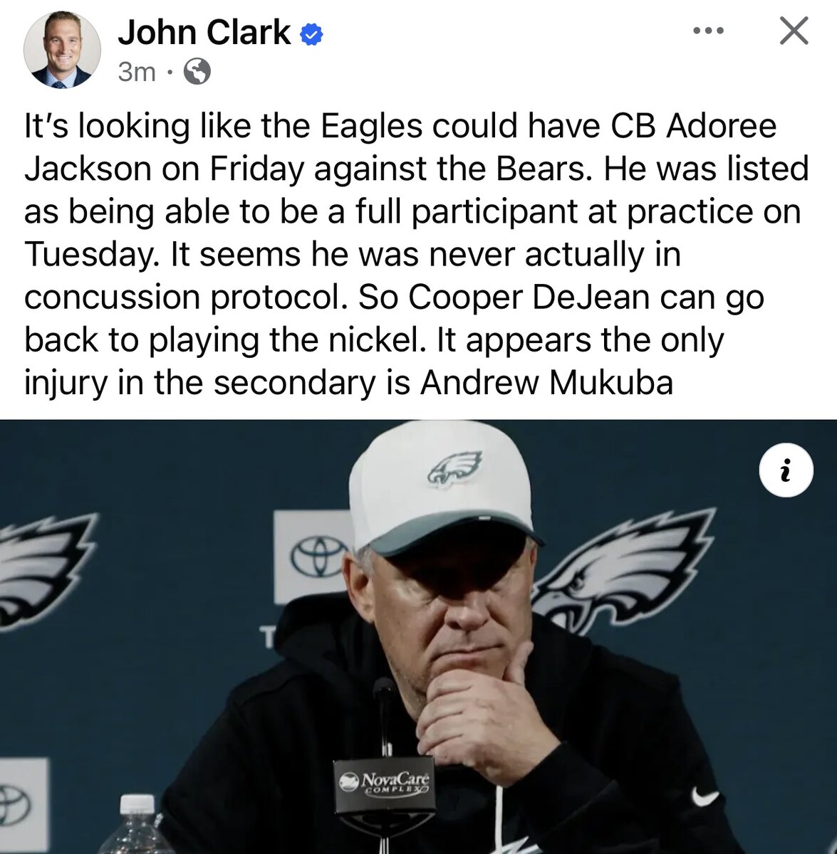 November 26, 2025Nov 26 39 minutes ago, EaglesAddict said:I don't think Carter has played much safety in his career has he? Even still, think I'd rather see that than Brown. Brown is a good ST'er, but he really does stink in coverage on D. Agree about Bennett...seems unlikely Jackson will play.Speaking of Jackson …