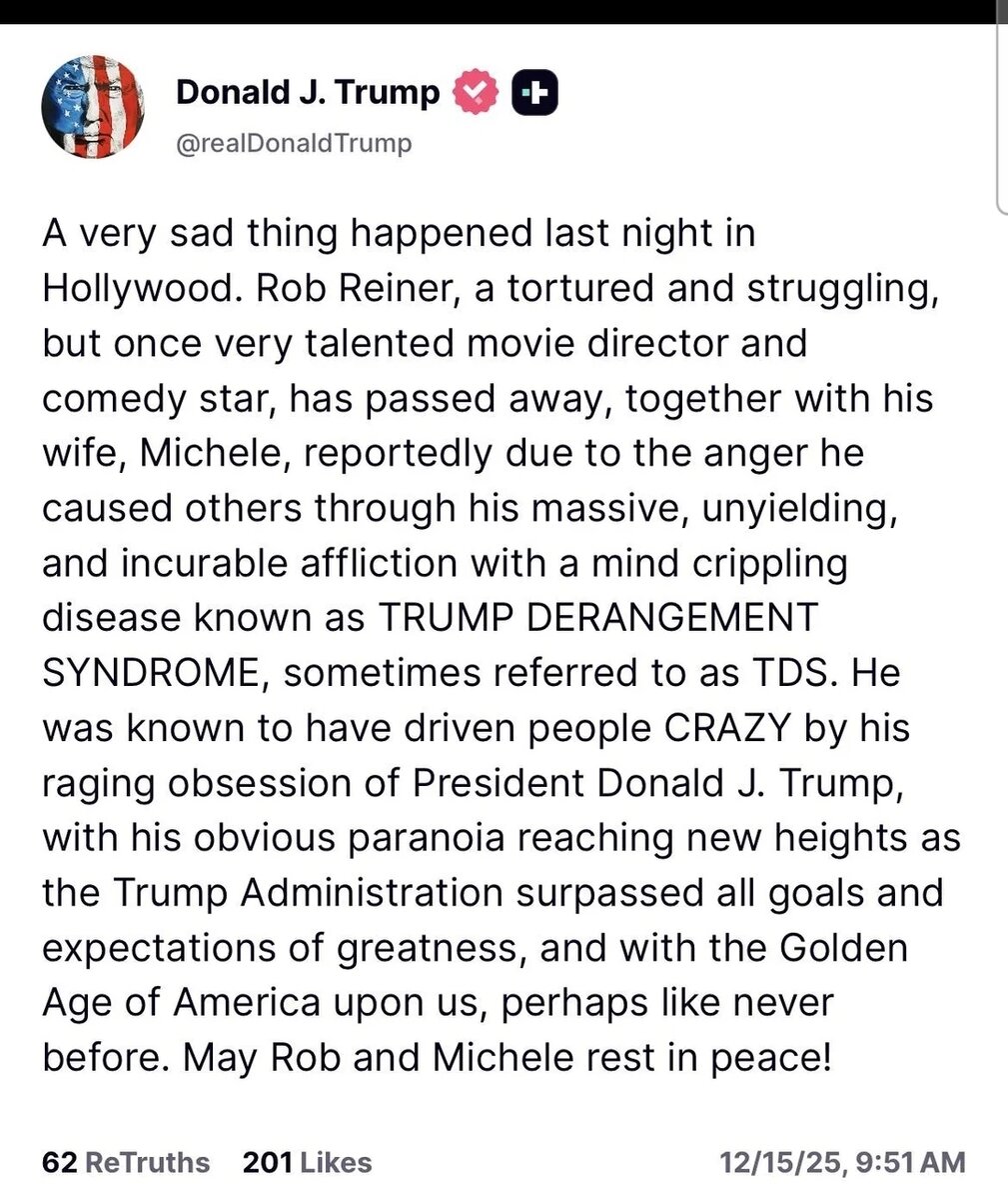 December 15, 2025Dec 15 https://www.usatoday.com/story/news/politics/2025/12/15/marjorie-taylor-greene-donald-trump-rob-reiner-post/87780797007/Controversial Georgia lawmaker Marjorie Taylor Greene lashed out at Donald Trump on Monday, Dec. 15, over the president's shocking social media post about the death of slain director and actor Rob Reiner.Reiner, 78, was killed alongside his wife, Michele Singer, in their Los Angeles home just one day earlier on Dec. 14, according to police. "This is a family tragedy, not about politics or political enemies," Greene, a Republican state representative and long-time Trump ally, wrote in a separate post on X.
