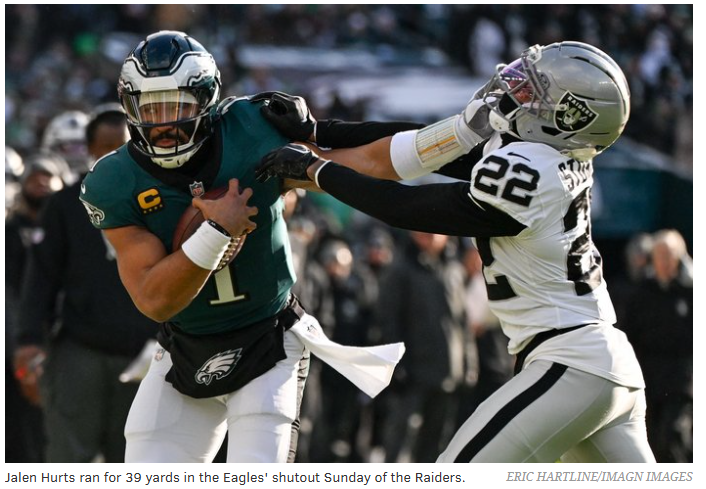 Posted December 18, 2025Dec 18 'Heavy is the crown' for Jalen Hurts, who responded big time in Eagles' shutout of RaidersThe arguments surrounding Hurts as an elite QB are never-ending, ever-shifting, and were back around these past few weeks. So he responded big time, like he always does.By Nick TricomePhillyVoice StaffEric Hartline/Imagn ImagesJalen Hurts helped put together an offensive showing that the Eagles desperately needed against the Raiders.Jalen Hurts sat down for his postgame press conference with a level of stoicism that could make a statue blink first. It was intense, even by any of the standards Philadelphia had come to expect out of its starting QB.The Eagles had just decimated the Las Vegas Raiders, 31-0, to end what had been a brutal three-game losing skid. Hurts himself went 12-for-15 passing for just 175 yards, but with three touchdowns and a 154.9 passer rating that was maybe one drop shy of being perfect again. He ran for another 39 yards on the ground, too, got sacked just once, and never turned the ball over.Sunday, within a bitterly cold and windy Lincoln Financial Field, was the kind of response the Eagles needed to dampen doubts, if just for a few days, that they were falling into another 2023-esque collapse. And it was the kind of response Hurts needed, after turning the ball over five times (and twice in the same play) in last Monday night's loss to the Chargers, with everyone watching, and many outside the Eagles' locker room ready to dismiss him as one of the NFL's elite."Everybody's watching," Hurts said with a gaze that pierced straight through the shadow beneath the brim of his cap. "It just comes with it, and it hasn't changed. I think everybody needs to remember where I come from and how I'm built. "I just want to lead in the right way, set the right example.""It's heavy to wear that crown, man," defensive veteran Brandon Graham said of his QB.The arguments surrounding Hurts have been never-ending and ever-shifting. He's led the Eagles to the Super Bowl twice in a three-year stretch, showed up big time in both of them, and won the latter one big time with MVP honors. He's seen the Eagles to the playoffs every year since he became the full-time starting quarterback in 2021, coinciding with Nick Sirianni's hiring as the head coach, and has been further than any of the QBs held up as the faces of the league who aren't named Patrick Mahomes – like Josh Allen, Lamar Jackson, Joe Burrow, Justin Herbert, and so on.Hurts and the Eagles also toppled Mahomes and the dynasty Chiefs in that last Super Bowl, but of course, as the arguments go, it wasn't because of him. It was the elite offensive line in front of him, it was Saquon Barkley in a generational year, it was DeVonta Smith and A.J. Brown as his weapons, and it was a fearsome defense that really compensated for everything. He was carrying the Lombardi Trophy down the Ben Franklin Parkway as the Super Bowl MVP, yet even then, the goalposts were always moving in the national eye, and during the three-game slide and especially after that terrible night against the Chargers, local, albeit volatile, talk radio even wanted to see him pushed out for backup Tanner McKee.In a way, it got what it wanted by the fourth quarter on Sunday, but only after Hurts threaded a pass through the seam to Brown for his last touchdown, which sent the Eagles up 31-0 and gave Sirianni the OK to pull the starters. Heavy is the crown."He's been handling it the right way," Graham continued about Hurts from the Eagles' locker room, in his week-to-week process and in the face of ever-building scrutiny from the outside. "It ain't always easy, because you're the guy that's gotta get all the blame for every little thing, just like Nick Sirianni, I feel like he does a great job, too."Heavy is the head that wears the crown. Everybody thinks they want it until they got it, and then they see how heavy that mug is.""Responded with a win," Hurts said with his short and unbreaking demeanor in the conference room next door. "So gotta continue to stack those one week at a time, one day at a time."Heavy is the crown.https://www.phillyvoice.com/jalen-hurts-eagles-heavy-is-the-crown-raiders-shutout-stats-reactions-brandon-graham/