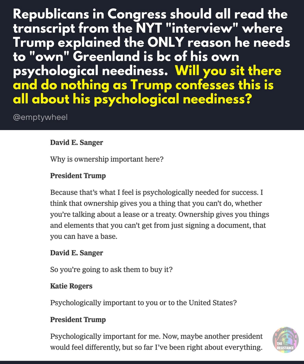 Tuesday at 06:07 PM1 day Trump Says He Wants 'Ownership' of Greenland Because It's 'Psychologically Important for Me' https://share.google/jobUGhtHDEzM2IPBj"ME" every time lmao. Thats all it's ever about