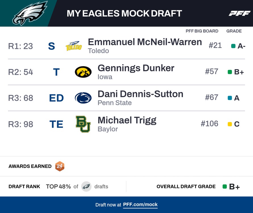 January 22Jan 22 59 minutes ago, SinCityEaglesFan2 said:that's the problem, this is not a good OT class. however I've also done mock drafts on PFF where Mauigoa drops to us ( I am RUNNING to the podium if that happens. ) the other tackles I like are Blake Fisher from Clemson or Monroe Freeling from Georgia.this years interior OL class is betterI need @just relax opinion on Freeling. Seems like he is rising all of a sudden