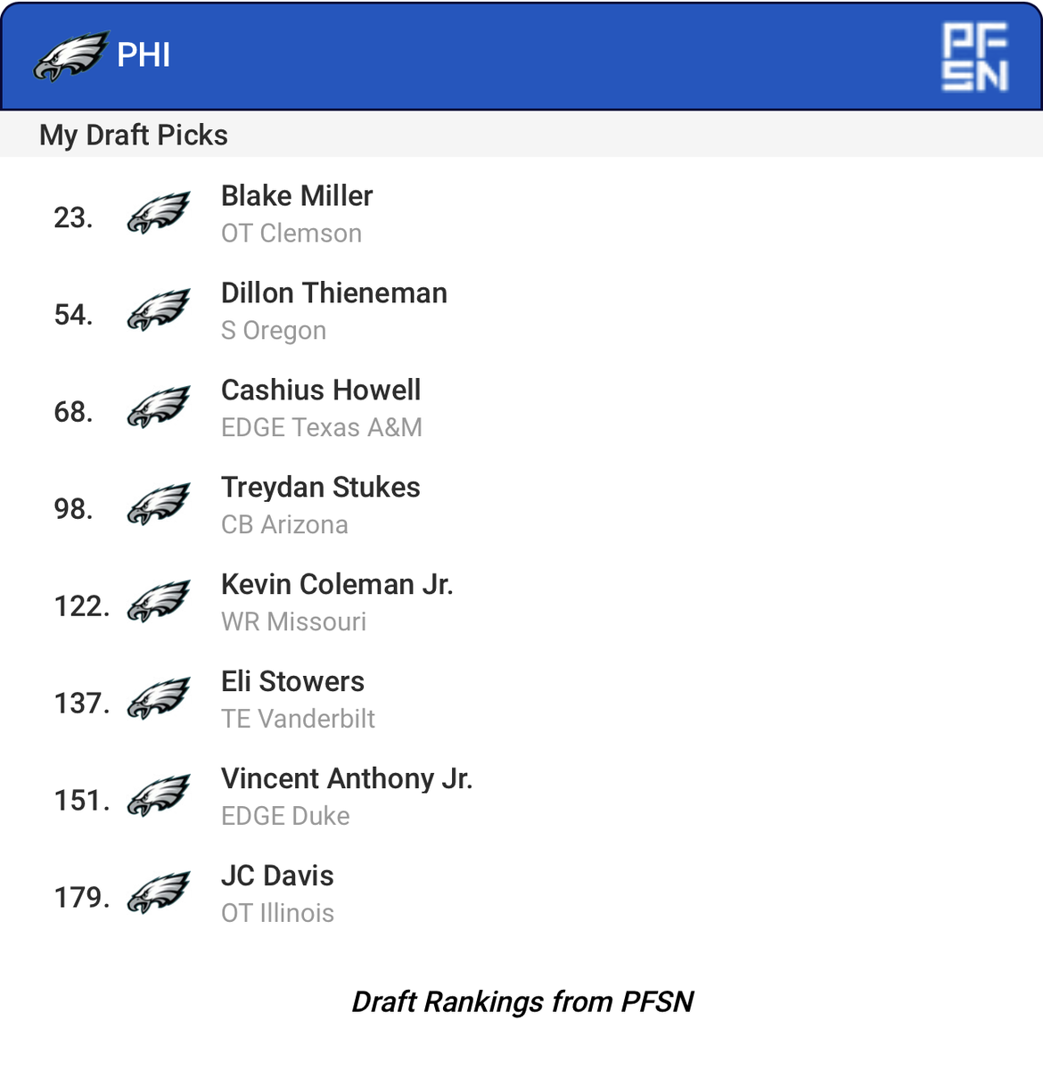 Tuesday at 04:28 AM2 days DJ has us taking CB Terrell. Not crazy about that. Doesn't seem to fit zone and is a bit undersized. Would much rather Hood or even Cisse. McCoy and Mansoor are most likely gone by 23.He has Howell going really early at 15 and Thieneman at 25. In all of these mocks I take those two guys in round 2, so guess that dream is coming to an end now.I did this one on Sunday before DJ posted his first today.I'm thinking Howie goes Miller or Freeling at 23 as Lane's end is not far away now. If one gets hot leading up to the draft then a possible trade up would also be possible to ensure he gets one.With the way this falls my personal favorite trade up guys outside the top 10 would be Lemon, Downs to a lesser extent Howell. Tate or Tyson would be ok too. Lemon to me could be the next Jaxon/Amon Ra style receiver that I would covet to get into the receiving core.Downs pushes the defense to the next level that I thought we were at but we're still a couple players away. I like Howell but not going up too high for him as I would the others.
