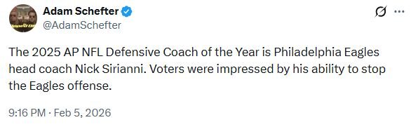 February 6Feb 6 13 minutes ago, LeanMeanGM said:Fangio should have gotten more votesIt’s kinda funny seeing Matt Burke considering Eagles fans didn’t like him at the time. Goes to show it’s not always on the field results to judge assistant coaches.Kubiak should have been no lower than second.