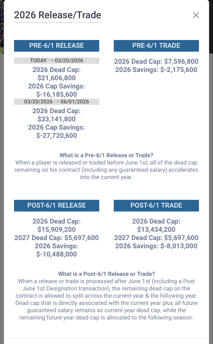 Thursday at 11:48 PM1 day 3 minutes ago, Sack that QB said:Bo Wulf brought up the possibility of moving on from Jurgens before his guaranteed money kicks in for the new league year. But I think he carries a lot of dead cap as well. So who knows. He was more spitballing, I don't think he did a full deep dive on the contract before bringing it up. I'd think that's more likely than Dickerson though based on their contracts.Jurgens contract if released or traded