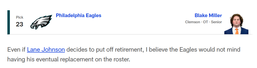 Wednesday at 03:54 AM5 days 44 minutes ago, Mike030270 said:Miller a yay or nay?He's alright. Very feisty with good temperament for a lineman, athletic, smart & durable, needs to get stronger and better in the run game. I'm not blown away though.Freeling, Iheanachor, Miller and Latu should all be close to where we select. I'm just not completely sold here. But my guess is they take one of them.I tend to like Freeling and Iheanachor the most, and the latter really is fascinating but he's green and needs time to learn & grow as a football player but Miller is interesting too. Combine will be interesting to see how they all test. This is where I wish Stout was still here.Using DJ's new mock i'd be tempted to just snag DT Woods or DE Howell right there. Woods isn't much of a need at all but he's really good. Howell i'd imagine fits Vic's mold as an edge.S McNeil-Warren went top 15 and S Thieneman top 20, they really flew up the board. Those are the two safeties I have liked all along. If either are there at 23 I wonder if we go that route. Unlikely but Howie broke the mold last year by selecting a first round LB.But if Downs wants to fall to like 13 because of his position and Howie wants to trade up for him I certainly wouldn't complain. Now that alone should elevate our defense to another level.