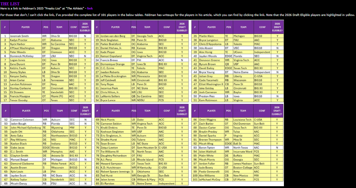 Wednesday at 04:00 PM5 days 30 minutes ago, garingovt2000 said:Found this randomly but a good look at the Freak Lists of guys in the draft (Yellow)Yes, they are freaks but are they also beasts?