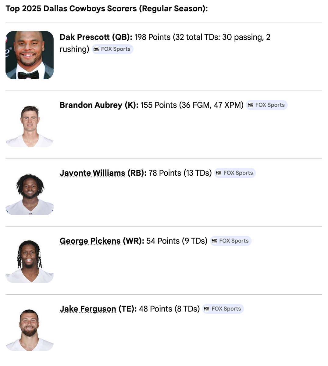 Wednesday at 05:09 PM5 days 38 minutes ago, paco said:He's most of the Cowboys offense, so yeah, worth it.Imagine how many points PHI would have scored this past year if Aubrey were kicking up there! 🤣...Unfortunately I couldn't scroll far enough down to show the 19th ranked team in ppg in '25:Aubrey wasn't even the leading scorer on the team:On a serious note, they need to get him for no more than 8m/yr...otherwise put the 2rd tender on him and see what happens...only player ever to go to another team on a 2rd tender was Wes Welker and that was a different type of tender. DAL will have a chance to match either way, no one is giving up a 2nd rd pick for a kicker.🤪