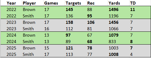 38 minutes ago38 min Is AJ's complaint the actual stats? Or the feeling that he can be utilized more, there are missed opportunities where he thinks he can dominate the defender? Like more vibes over numbers?In looking at both WRs numbers since 2022 (when they both were on the team together):2022: AJ's first year here, the targets and receptions were pretty close and he led both categories, and he had more yards and TDs. 2023: Brown had significantly more targets, receptions and yards and the TDs were the same. This was a year under Brian Johnson when everyone complained about the offense.2024: both WR numbers down due to dominant run game. But like 2022, targets and receptions were close. Brown slightly more targets, Smith 1 more reception, Brown still more yards, Smith 1 more TD. 2025: similar to 2024 in how close the numbers were to each other except TDs, also Brown played 2 less games and they played Smitty the final game to pad his stats then sat him.