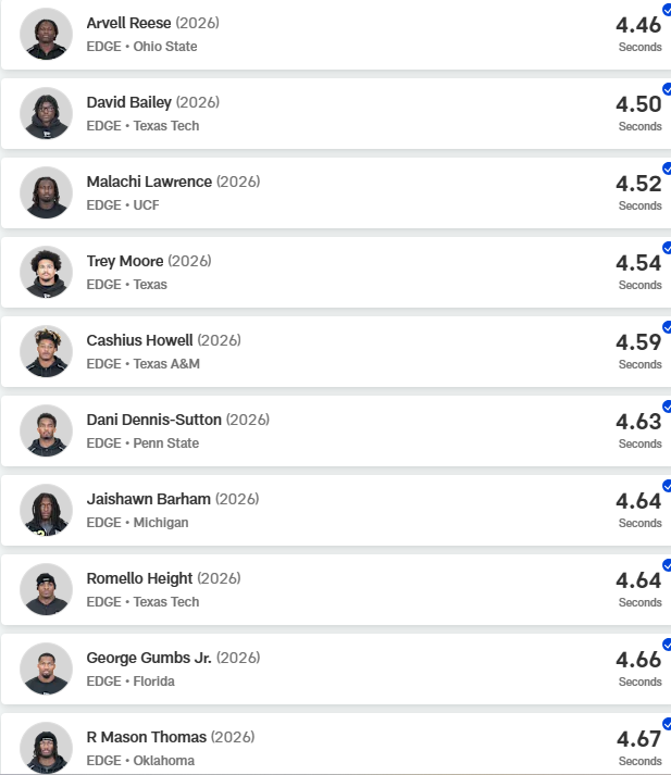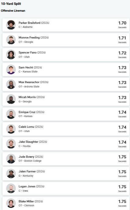 1 hour ago1 hr Key Takeaways for OT 10-Yard Splits:Elite/Top-Tier: 1.65s - 1.70s (Highlights elite lateral agility and "first-step" quickness for pass sets).Very Good: 1.70s - 1.72s (Highly desirable for zone-blocking schemes and quick pass sets).Good/Solid: 1.73s - 1.75s