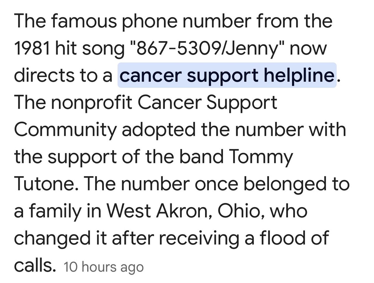 March 23Mar 23 5 hours ago, LacesOut said:Guys, if you need anything, please call me. I'm available 24/7.My number is 867-5309.That actually was my phone number for a brief time- January of 1996 to April of 1997- my apartment during my last semester in college and about a year after graduation.Asked for it when I moved into an 867 exchange, and in the time before everyone had all their numbers programmed into cell phones, my friends never forgot my phone number. It was a glorious experience that became less glorious once I got a real job and had drunk people calling me in the middle of the night. The last of my roommates who lived at that apartment moved out in about 2005, and it hasn't been in service in my area code since.