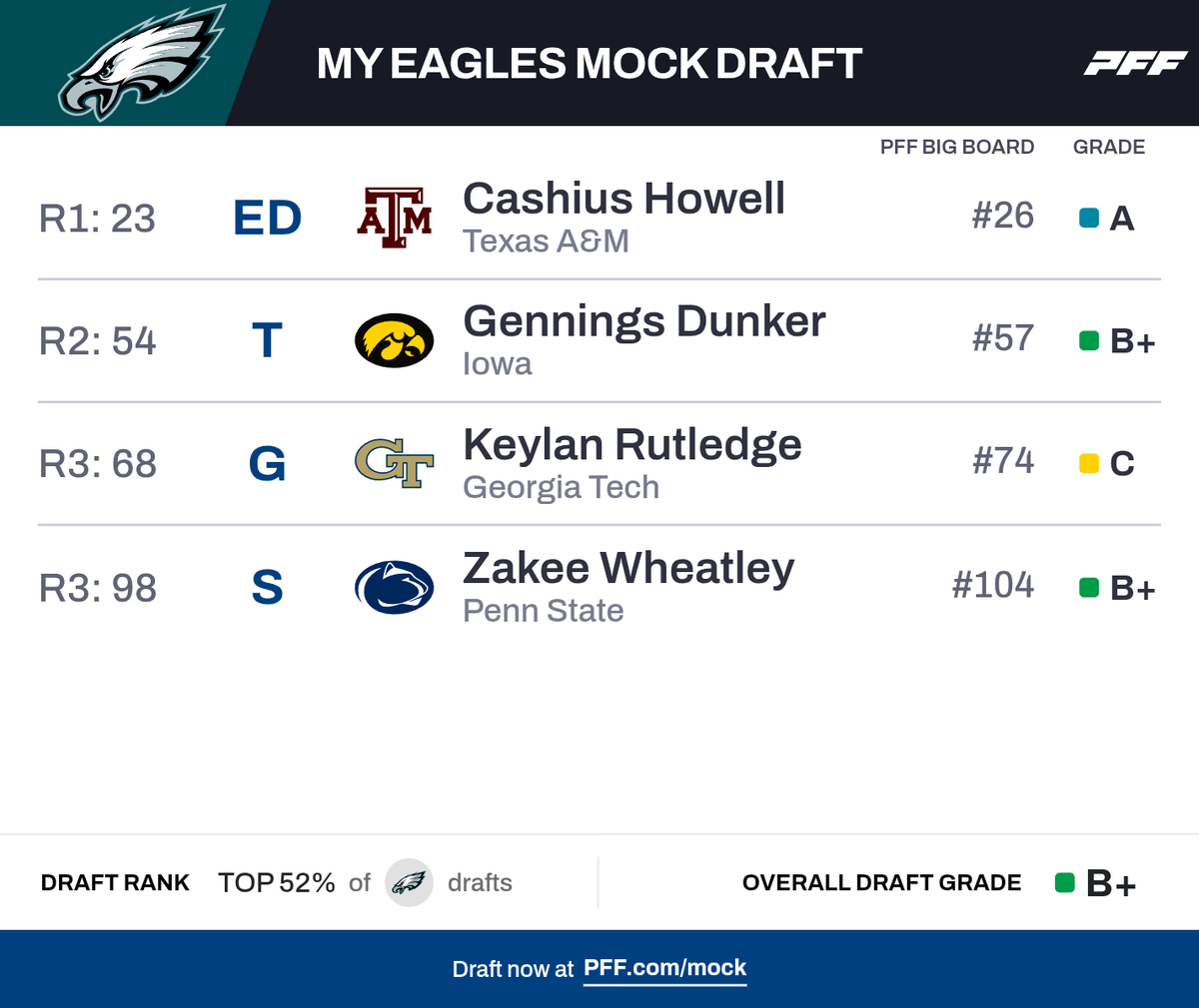 March 28Mar 28 6 minutes ago, HazletonEagle said:Height is another old one I believe.Im really not loving a lot of their top 30 list so far.I like Chris Bell if we can really replicate the rams style of offense because he will have a role perfect for what his skill already is. But some people really dont like him much and he probably has a high bustability potential if not used properly. I dont have a big problem with either of your first 2 picks, but youre starting off with 2 big gambles. That feels extreeeeemely risky. Then Height, who is about to turn 25 before the draft I think...The only pick there Ill love is Klare.Id be mad at Howie that weekend.I just looked at Brugler’s top 100 and he had Height in the 90s and knew the Eagles brought him in for a visit. Feel free to swap someone else in there. As for round 2 and the top of round 3, maybe Klare is our second round pick and a guy like Lance is our first pick in round 3.