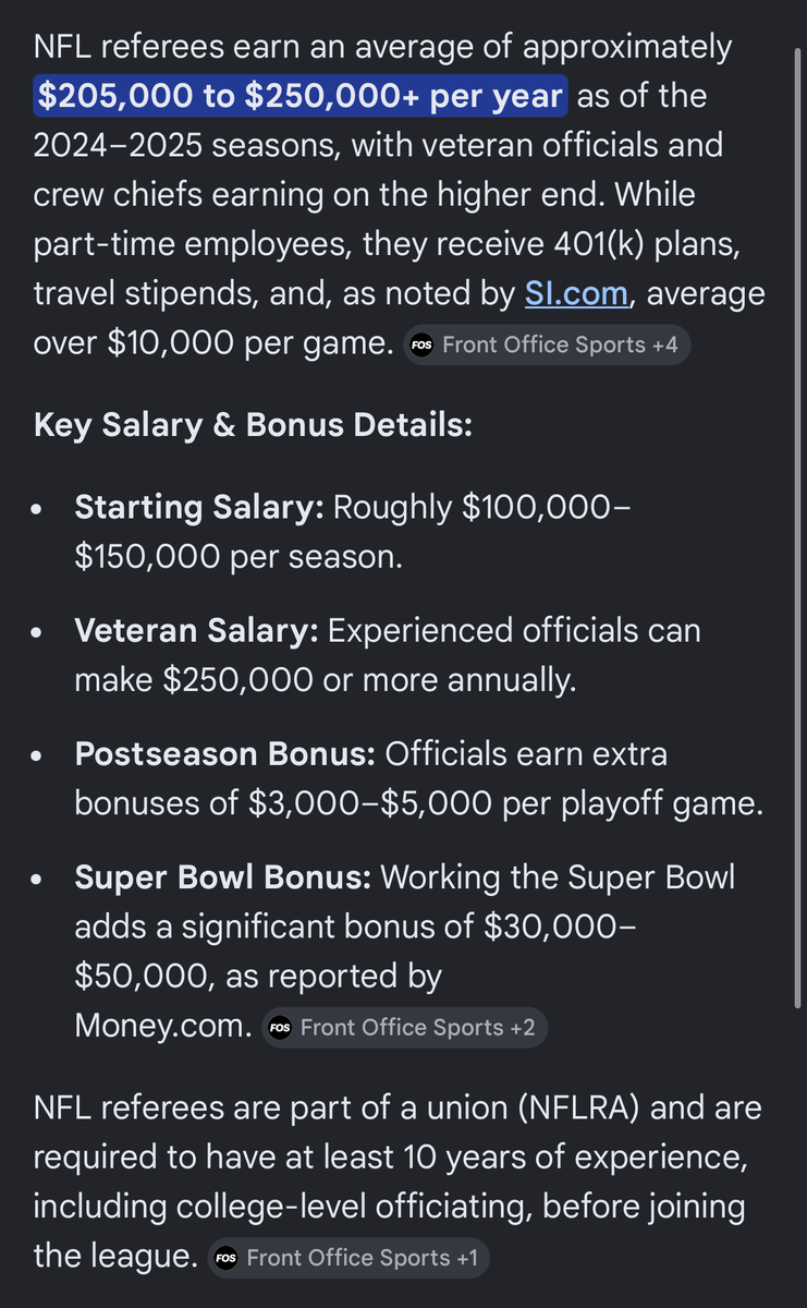 March 30Mar 30 1 hour ago, BigEFly said:Athletic article says the average ref’s pay is $350,000.Seems like there’s a range with some making more than others. I guess if I want get in on this gravy train I just need to get a college gig and put in 10yrs - the nepo babies are probably already lined up though.