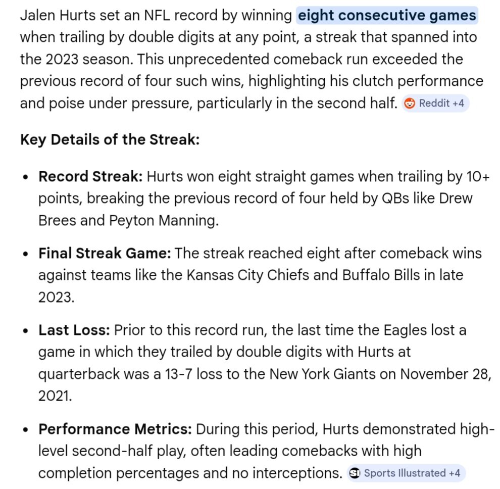 March 31Mar 31 1 minute ago, just relax said:Four come-from-behind wins in 2023, ties the single-season record. And there's this.The research for this page was done by Scott Kacsmar. Read our About page for full details.View complete leaderboards for game-winning drives and comebacks.10 Fourth Quarter Comebacks, 13 Game-Winning DrivesShare & ExportModify, Export & Share TableGet as Excel WorkbookGet table as CSV (for Excel)Get Link to TableAbout Sharing ToolsVideo: SR Sharing Tools & How-toVideo: Stats Table Tips & TricksData Usage TermsGlossaryRkYearG#DateAgeTmOppResultCmpAttCmp%YdsTDIntRateY/AAY/AAttYdsY/ATDNotes1202152021-10-1023-064PHI@CARW 21-18223759.461980162.75.354.149303.3324QC / GWD22021162022-01-0223-148PHI@WASW 20-16172665.382140090.98.238.237446.2904QC / GWDRkYearG#DateAgeTmOppResultCmpAttCmp%YdsTDIntRateY/AAY/AAttYdsY/ATDNotes3202252022-10-0924-063PHI@ARIW 20-17263672.222390089.96.646.6415614.072GWD42022102022-11-2024-105PHI@INDW 17-16182572.0019010107.17.608.4016865.3814QC / GWDRkYearG#DateAgeTmOppResultCmpAttCmp%YdsTDIntRateY/AAY/AAttYdsY/ATDNotes5202342023-10-0125-055PHIWASW 34-31253767.5731920112.38.629.709343.780GWD6202382023-10-2925-083PHI@WASW 38-31293876.3231940135.78.3910.50461.5004QC / GWD72023102023-11-2025-105PHI@KANW 21-17142263.641500164.66.824.7712292.4224QC / GWD82023112023-11-2625-111PHIBUFW 37-34183158.062003196.26.456.9414654.6424QC / GWDRkYearG#DateAgeTmOppResultCmpAttCmp%YdsTDIntRateY/AAY/AAttYdsY/ATDNotes9202432024-09-2226-046PHI@NORW 15-12293876.323110188.88.187.008253.1304QC / GWD10202452024-10-1326-067PHICLEW 20-16162564.0026420126.110.5612.1614332.360GWD112024102024-11-1426-099PHIWASW 26-18182864.292210088.57.897.8910393.9014QC / GWD122024132024-12-0826-123PHICARW 22-16142166.6710820110.85.147.058597.3814QC / GWDRkYearG#DateAgeTmOppResultCmpAttCmp%YdsTDIntRateY/AAY/AAttYdsY/ATDNotes13202532025-09-2127-045PHILARW 33-26213265.6322630117.47.068.949404.4414QC / GWDI have that guy on ignore but I remember a stat from the 2023 season that dated back to the start in 2021 or 2022 where Hurts had the longest streak in NFL history for a QB of winning games where the team has fallen behind by double digit points.