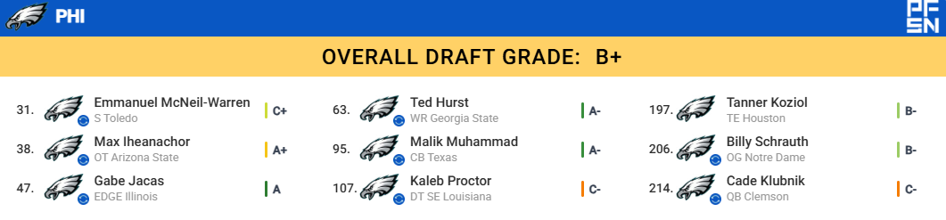 Tuesday at 12:49 PM2 days Some interesting names for each position... Has Icheanachor as OT with most upside, McNeil-Warren at Safety, Proctor at DT. Has Jaishawn Barham out of Michigan as his edge with the most upside