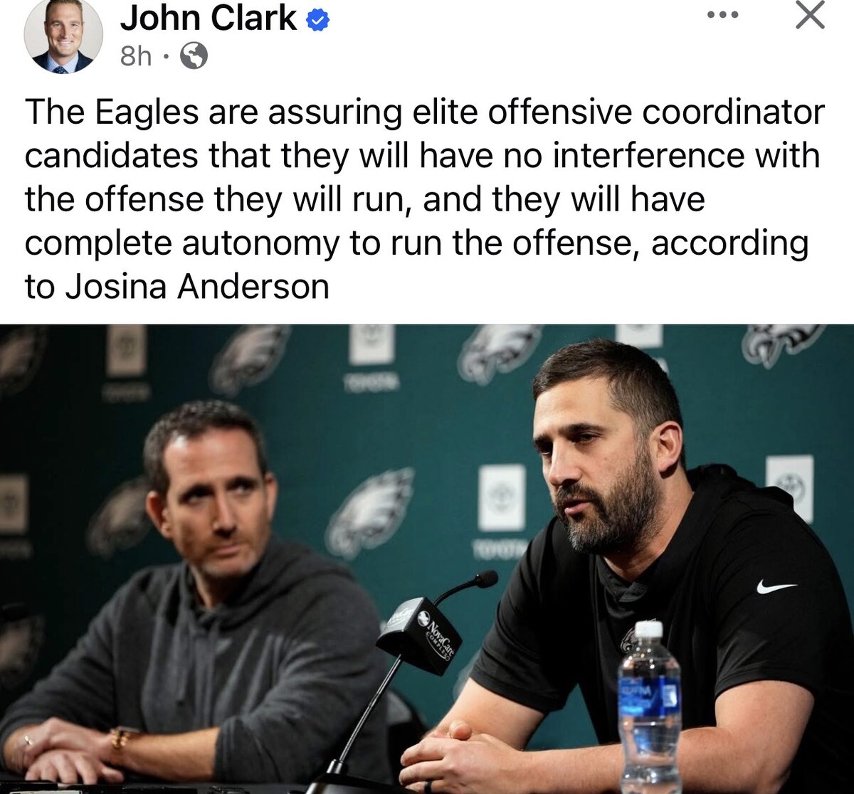 January 15Jan 15 1 hour ago, time2rock said:I would have to think that there were certain things discussed between Howie/Lurie and Sirianni when they met after the season ended (a multiple part ultimatum was given) that included replacing Patullo and allowing whoever they hire to run their own offense (not Sirianni's). This was expected ... we've mentioned this as a likely outcome for most of the season watching the offense struggle and nothing changing week to week.Or it could just be Josina Anderson pulling things out of her ass because she knows she's throwing it at people that really want to hear it, I guarantee if the offense fails next year people will still blame Sirianni.