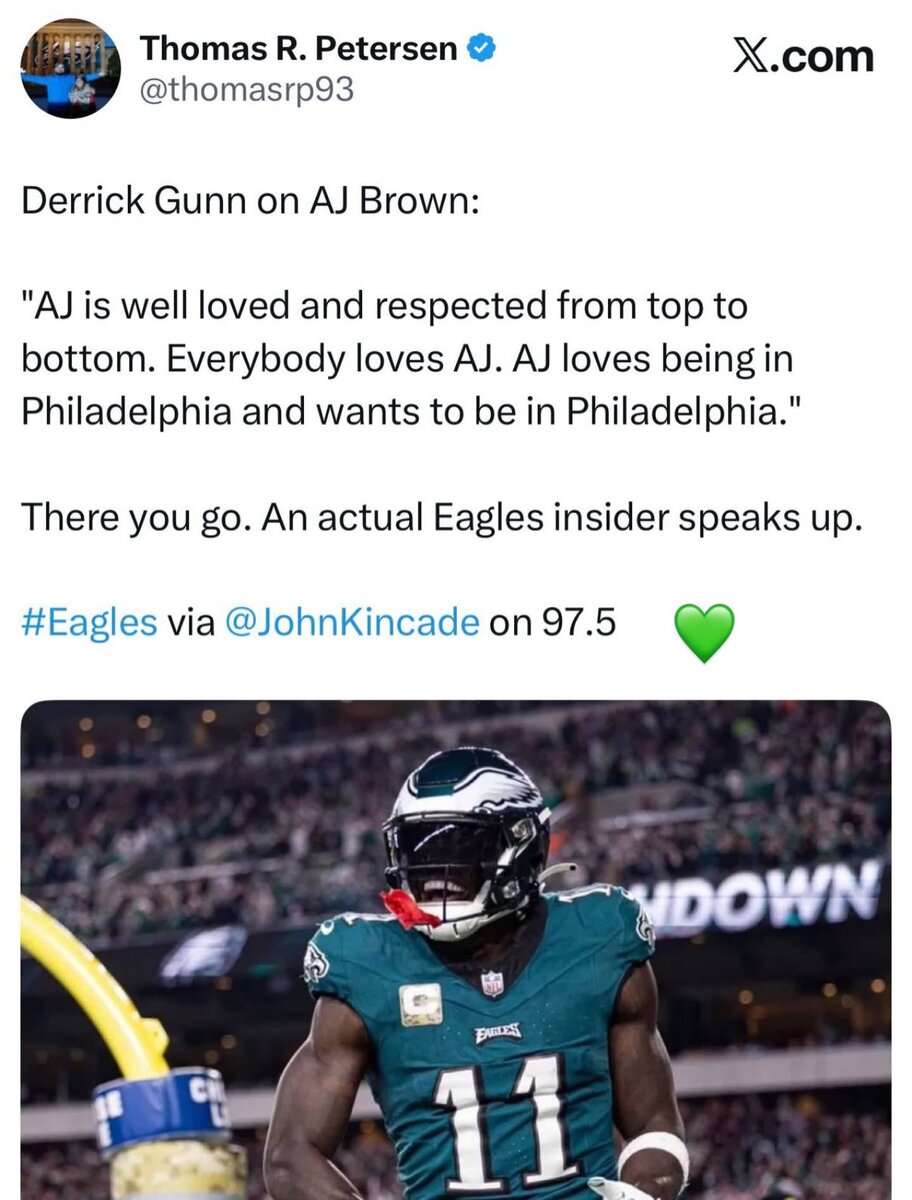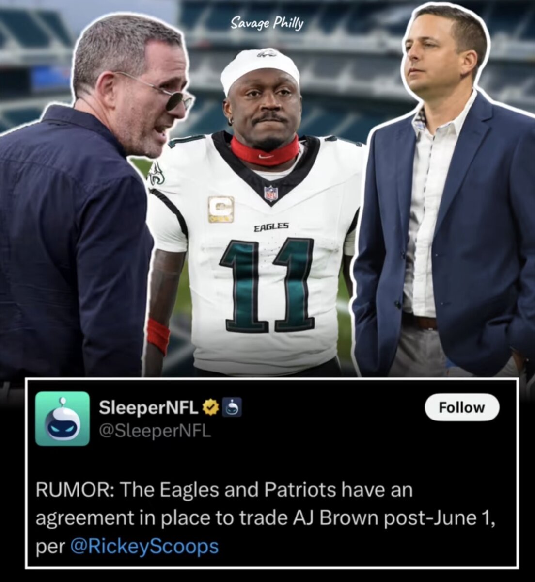 March 31Mar 31 6 hours ago, ManchesterEagle said:Based on what Siriani and Roseman said or didn’t say at the owners meeting, I think it’s more likely than not that AJ gets traded. Probably after June 1.He's a Philadelphia Eagle is the most un-Howie type of answer I think I have ever seen. He went from we don't trade great players and AJ Brown is a great player (at the deadline) to it's my job to listen on all players (at the start of the off-season) to "he's an Eagle." I think it's pretty obvious the trade market just never materialized for him the way the Eagles had hoped or fans thought. At this point it looks he either goes to the Pats post June 1st for what I suspect will be an underwhelming return, or they just keep him and hope he doesn't have any major meltdowns for one more year.
