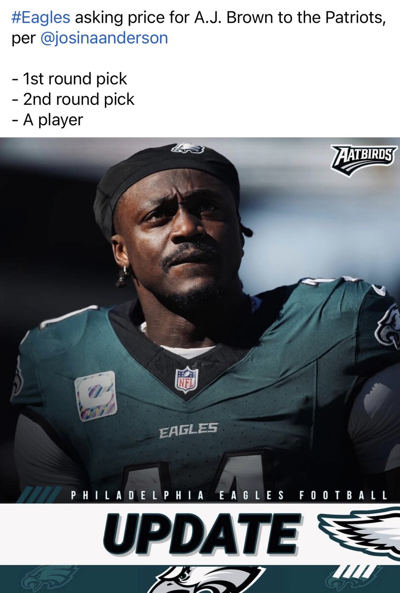 March 6Mar 6 6 hours ago, PoconoDon said:I expect AJ Brown to be an Eagle for the 2026-2027 season.I don’t thinks so bud. If teams are actually throwing compensation around then it’s probably not likely.