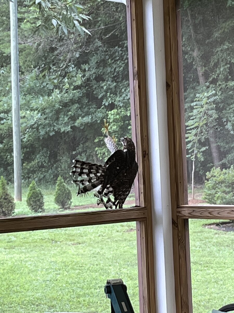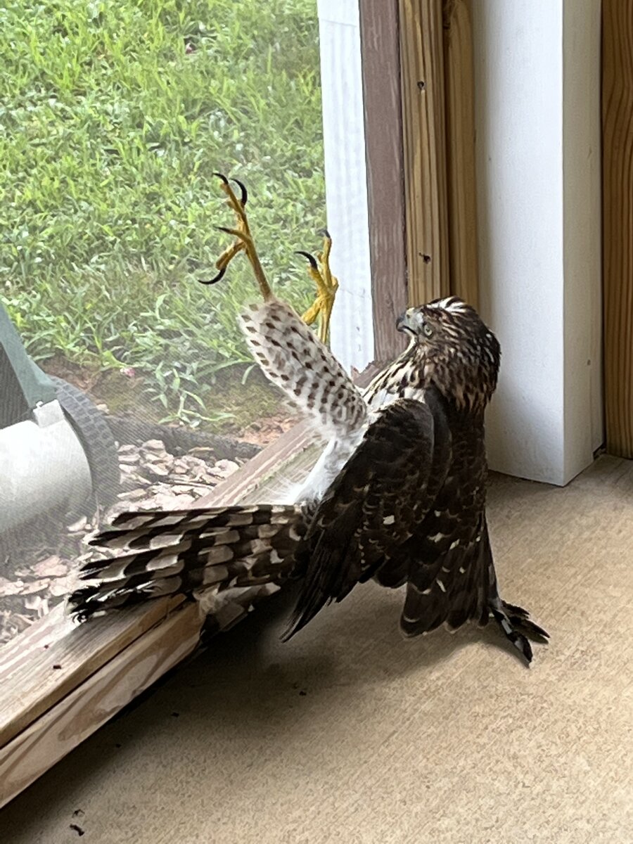 July 27, 20223 yr Bit o excitement this morning, went out to the screened porch to feed the cats and a red-tailed hawk had broken through the screen and was trapped on the porch, trying to find a way off. Apparently that majestic dope was coming in hot and flew right through it