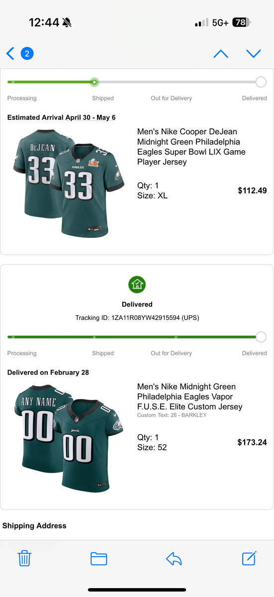 May 1, 2025May 1 On 4/28/2025 at 2:53 PM, BFit said:Is it the sheet quality one with screen printed sleeve cuffs? That's how my BG one came....Yes, which I knew. I don’t know if it’s because of the "De” with the second capital letter in the name (which I personally have as well), but his was the only name NOT available for custom jerseys. I’m talking 3rd starting lineman and long snappers are selectable online, but not cooper. I wanted his for the white corner aspect and a SB patch for the pick six, and the screen print was the only option for either. I almost never wear the authentic for feat of stains, damage, etc — so figured a screen print one I can safely wear if going out to bars and stuff during football season to watch games with people. Also got like 25% off code because of issues with their systems the night of the Super Bowl. On 4/29/2025 at 12:02 PM, HazletonEagle said:I ordered a DeJean screen printed jersey from NFL shop, which is still Fanatics anyway.They must have folded it up and packaged it hot off the press. When it arrived I opened the package, and my jersey was all stuck together. Black sleeves sticking to numbers, numbers sticking to the letters on the nameplate. There was no way to open the jersey up without stuff peeling apart. It was ruined on arrival.The good part is they sent me a return label, and shipped a new one out next business day delivery. And sent me a code for 25% off. So I was happy with the customer service. No questions asked. No painstaking process of having to send pics for them to check out...But yeah... its always something. I don't now how they were allowed to form this monopoly.I ordered all mine the eagles pro shop website which is still fanatics. I got tons of discount codes because of issues after the Super Bowl so I bought a few Eagles authentic vapor elite fuse that has the old "Eagles” font on the front that there were already doing a deep discount on.
