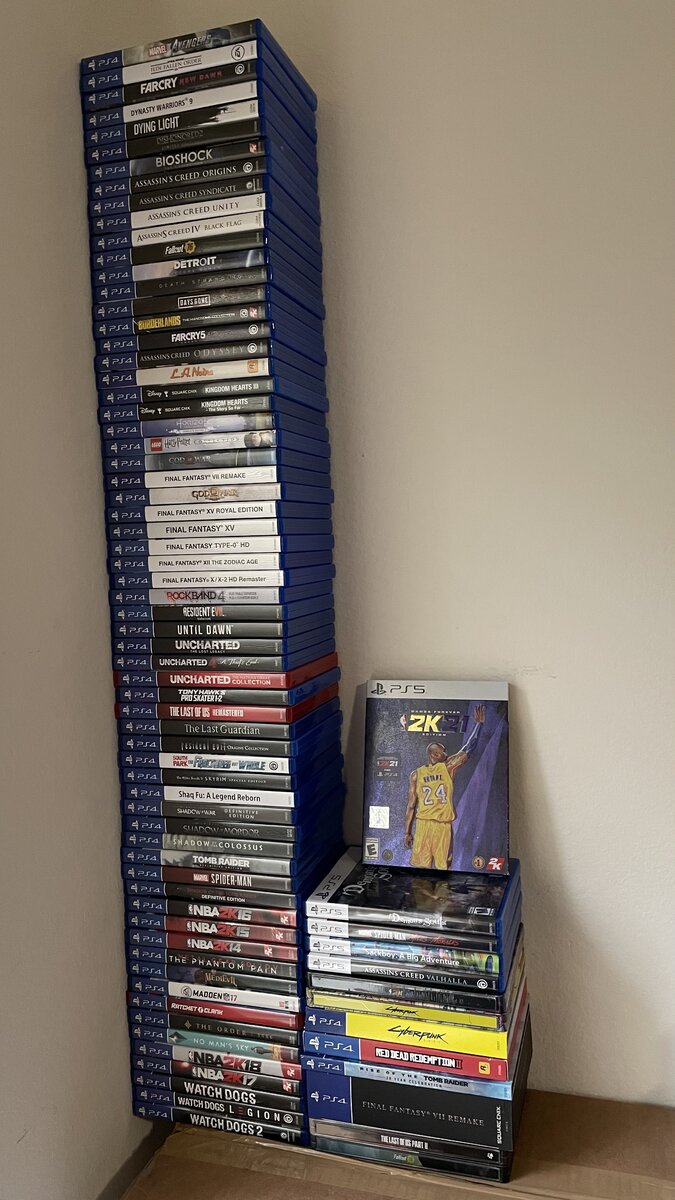 May 14, 20214 yr 9 hours ago, Agent23 said: My PS4 Pro has been packed up sitting in its original box since November when I packed up my stuff to move to MN. I keep forgetting to post the damn thing online for sale. A bunch of games I own are free on PS+ collection for PS5 owners, along with however many have been given as free monthly games over the years. So I think I want to just bundle all the discs I’ll never touch due to having those digital copies. Unpacking boxes this morning that have all my game and movie cases and my PS4 disc collection was a bit more than I remembered lmao I have owned and traded in most of those titles lol. Nice collection though!