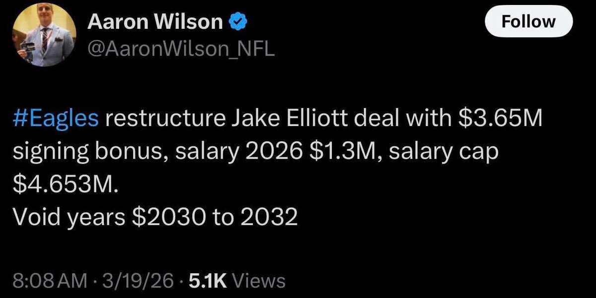 March 19Mar 19 Author First Dickerson and now Elliott with a contract that has been revised. Base pay reduced from $6M to $5M for the 2026 season (results in $240K in cap savings in 2026).https://www.nbcsports.com/nfl/profootballtalk/rumor-mill/news/eagles-rework-jake-elliotts-contract