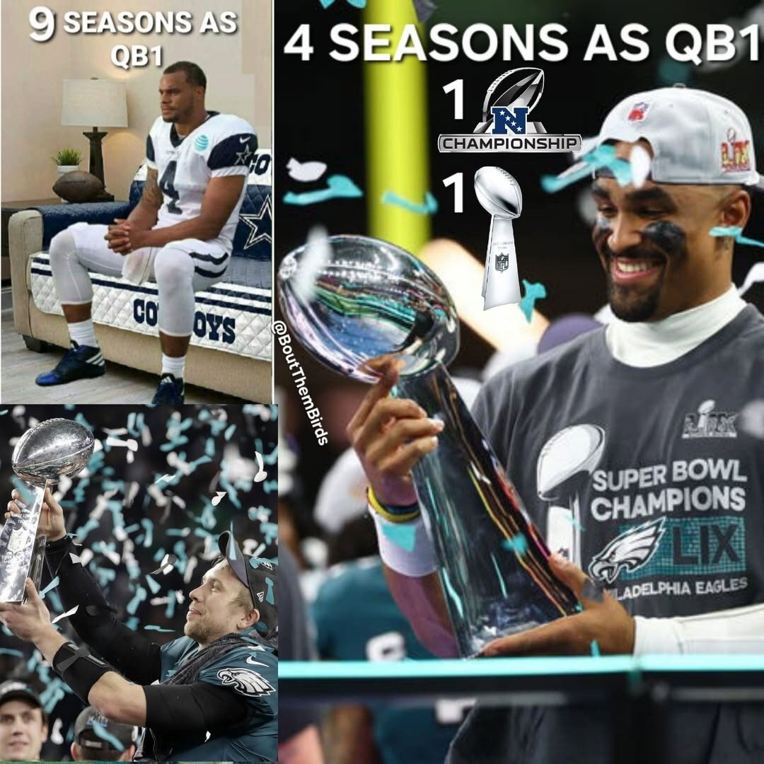 March 29Mar 29 On 2/13/2025 at 3:09 PM, NOTW said: The $30 Million to the right of Dak own two NFC Championships, one NFCCG loss, two Super Bowl appearances and one Lombardi/Super Bowl MVP award. (Did Daniels get some awards for his season?) While the $90 Million got the Cowboys... um.... some NFC East Champions hats?
