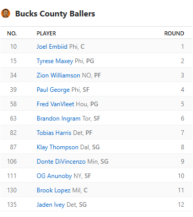 February 26Feb 26 This might be the worst fantasy team I've ever feilded in any sport...ever. I should just get Ben Simmons to make it perfect. He fits so well with Zion, Paul George, Embiid, Dramon Green, Van Fleet, and Brandon Ingram.