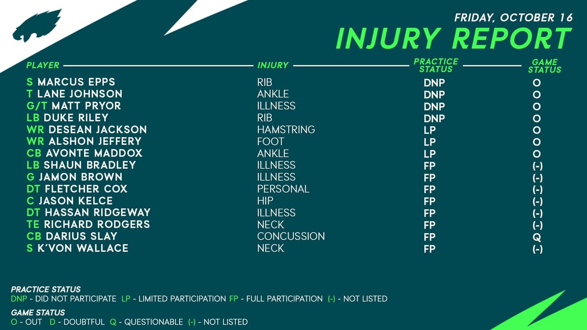 October 16, 20204 yr Jeffrey and Jackson out again...but the depth chart Lane Johnson, Pryor, Maddox out.