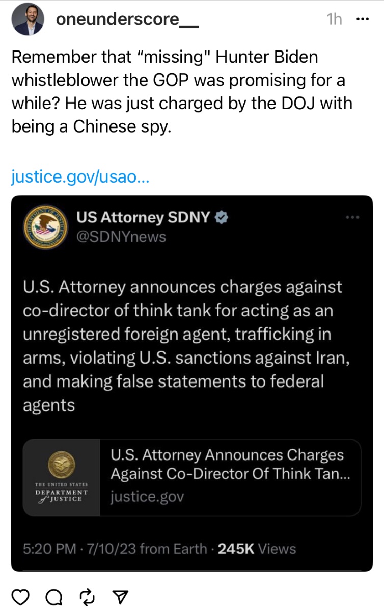 July 11, 20232 yr 1 hour ago, Talkingbirds said: So Joe and Hunter had dealings with a Chinese spy ? Or, and hear me out because this is a pretty wild theory, the Chinese spy isn’t a credible source.